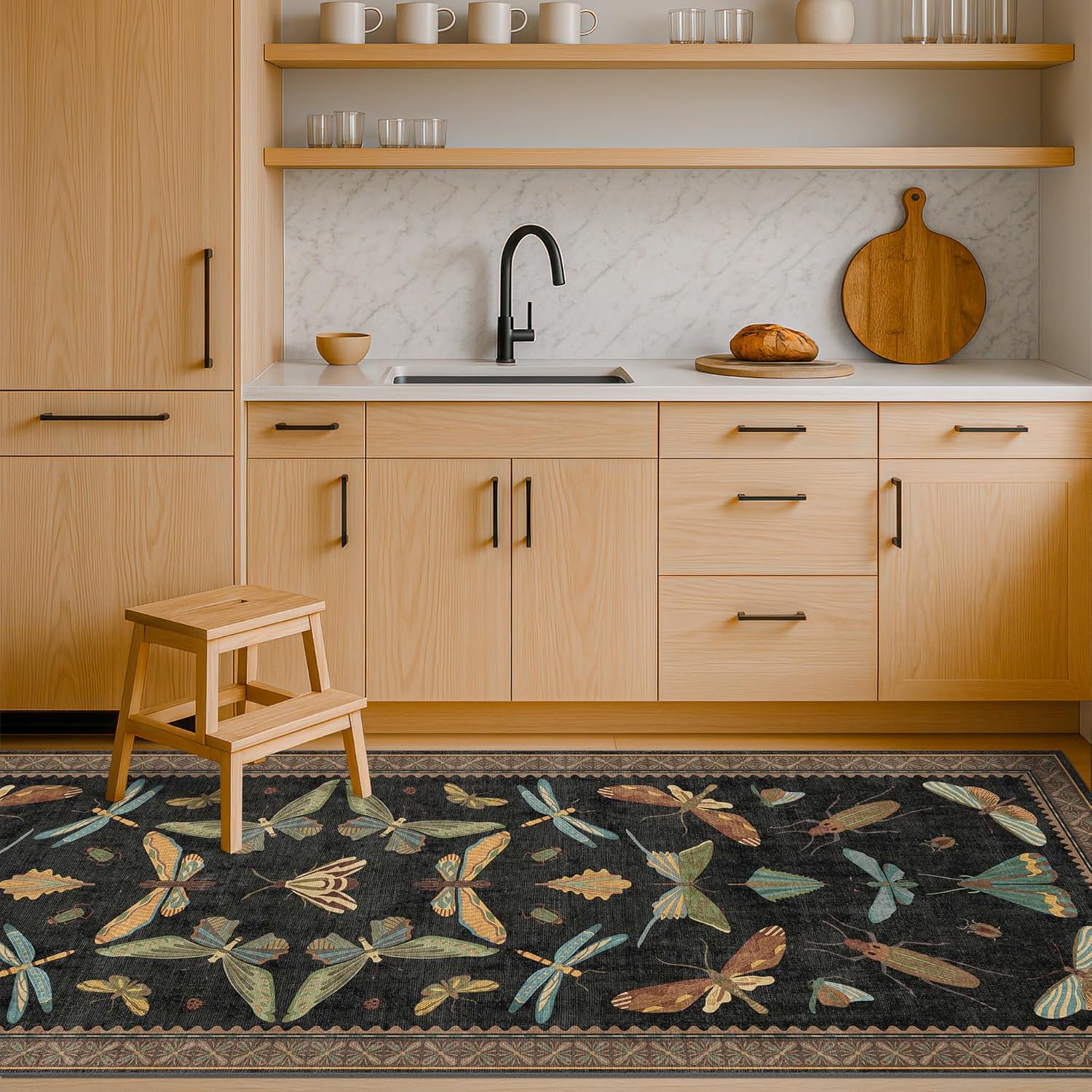 - Eclectic Vintage Charm: Make a bold statement with this insect-themed area rug, set against a black and brown background. Intricate illustrations of moths, butterflies, and dragonflies shine. Earthy tones of mustard, teal, sage green, rust, and pale blue give a warm, vintage feel. The symmetrical arrangement and scalloped interior edge bring to mind classical natural history art, while the stylized floral border adds a handcrafted touch. Ideal for antique, boho, or cottage-inspired interiors