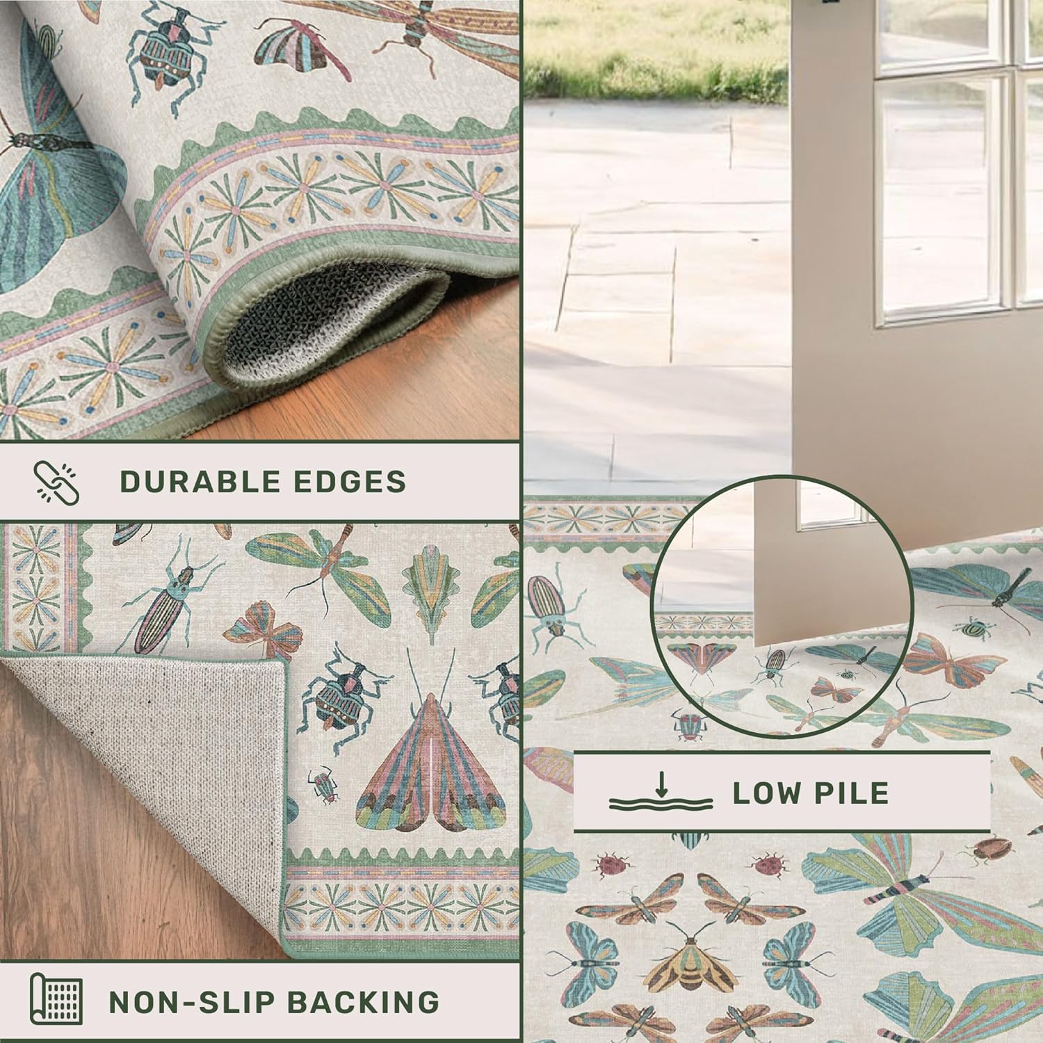 5x7 Pink and Green Nursery Rug - Colorful Rug for Bedroom, Living Room, Insect Butterfly Floral Non-Slip Soft Carpet