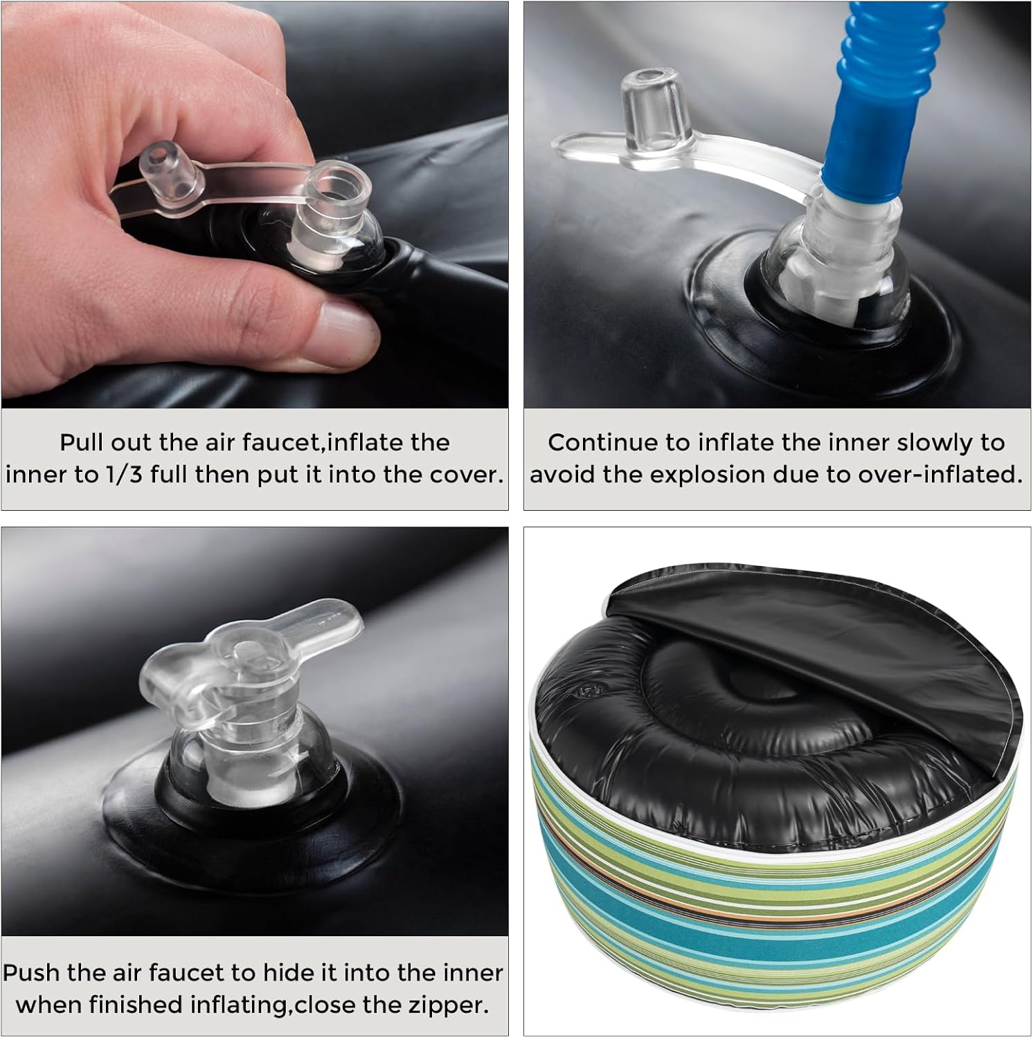- ăDurable Outdoor Materială-Inflatable ottoman cover made from durable, waterproof material that can withstand exposure to all weather. Fade-Resistant keep its original color and pattern even if exposed to the direct sunlight for over 500 hours. The black inner made of waterproof thick PVC fabric that can bear up 300 lbs.Very easy to clean and maintain.