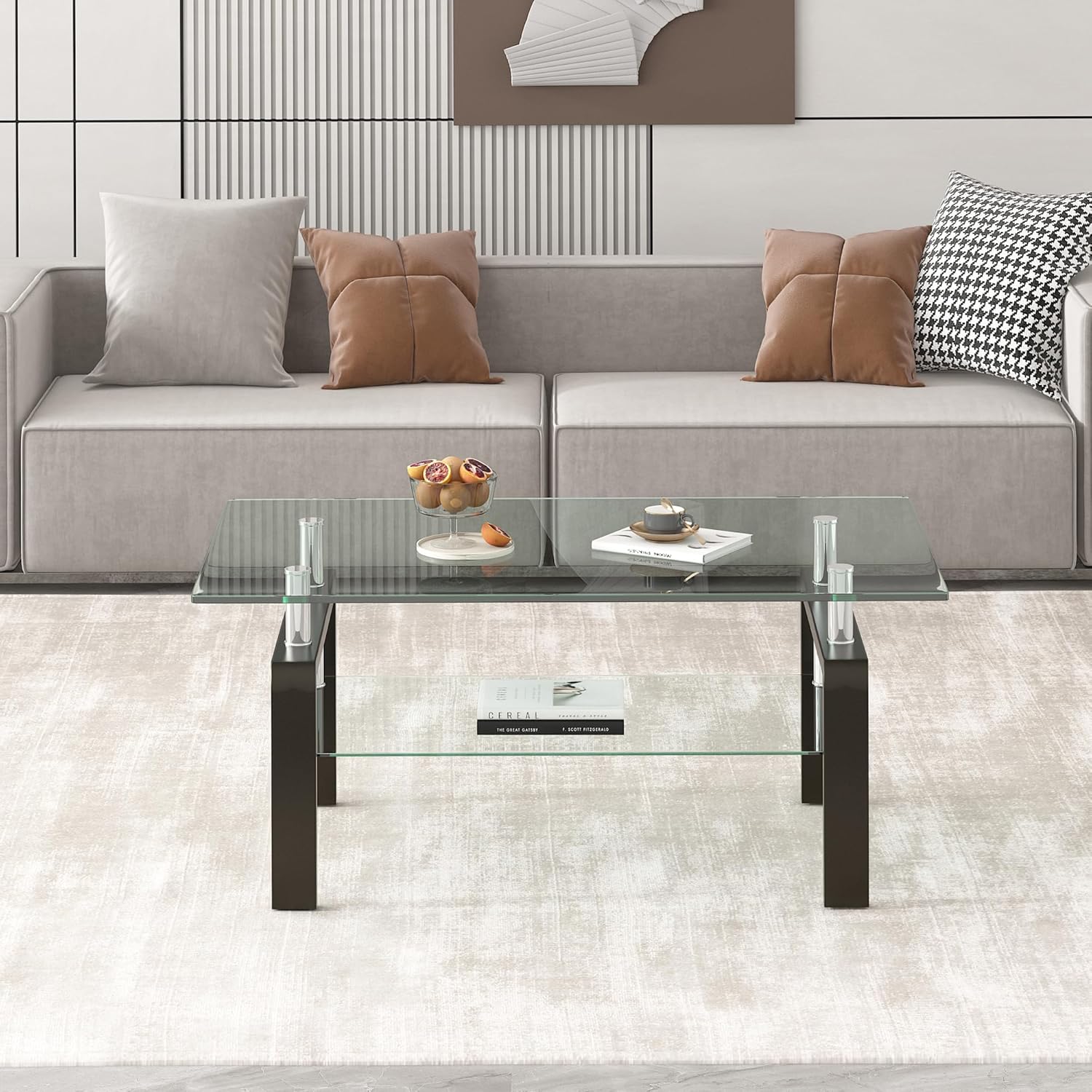 Glass Coffee Table Rectangle Living Room Center Table, with Tempered Glass Tabletop Black Metal Leg,for Living Room and Office (Dou-Clear Glass)
