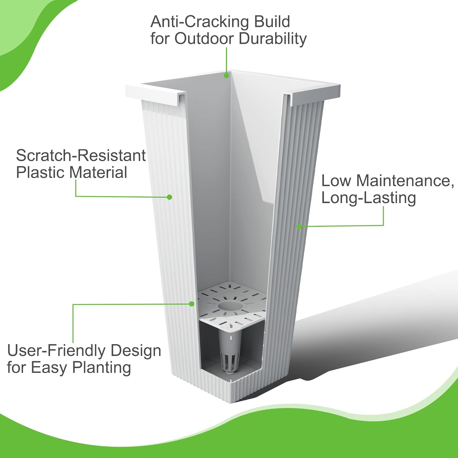- Built to Endure All Weather Conditions: Crafted from premium, weather-resistant plastic, these tall planters for outdoor plants are designed to resist cracking, fading, and damage from the sun, rain, and snow. Perfect for any season, these large planters for outdoor plants ensure long-lasting durability, making them an excellent choice for outdoor and indoor gardening alike.