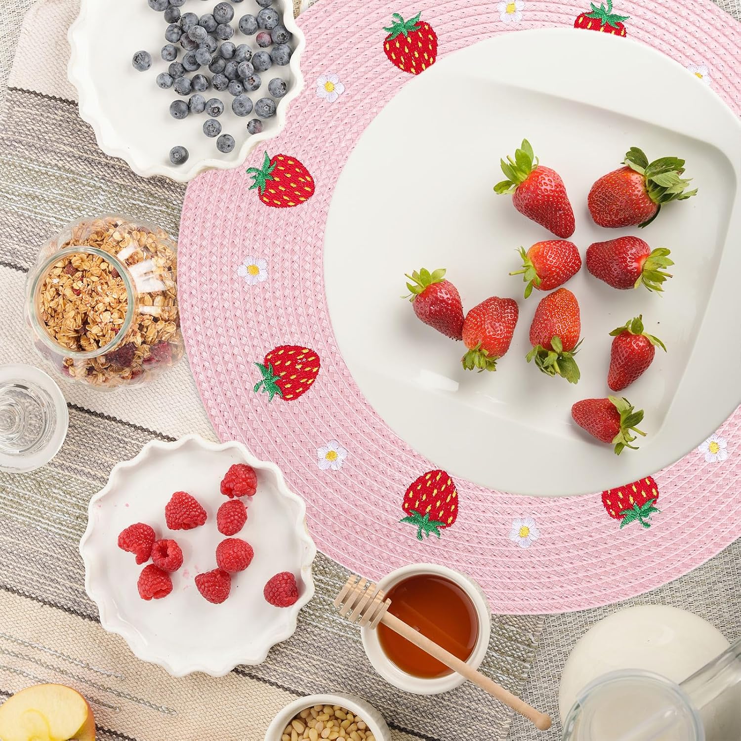 Whaline 4Pcs Round Placemats Daisy Strawberry Embroidered Place Mats Summer Strawberry Dinner Table Mats for Home Wedding Baby Shower Birthday Party Decor