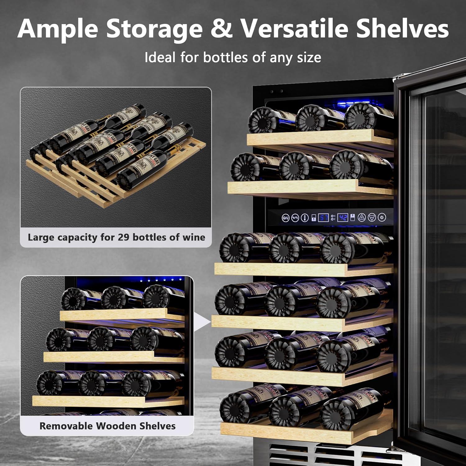 - Spacious & Versatile Storage: The wine fridge holds up to 29 standard Bordeaux bottles, providing ample space for all your favorites. The wine cooler has adjustable shelves that can easily accommodate bottles of different sizes.