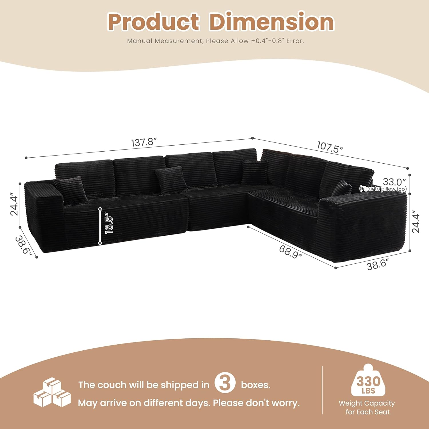 HOOOWOOO Cloud Sectional Couches for Living Room,Modular Sectional Sofa No Assembly,138X108 Inch Plush Corduroy Large L Shaped Floor Couch Set with Deep Seat(Black)