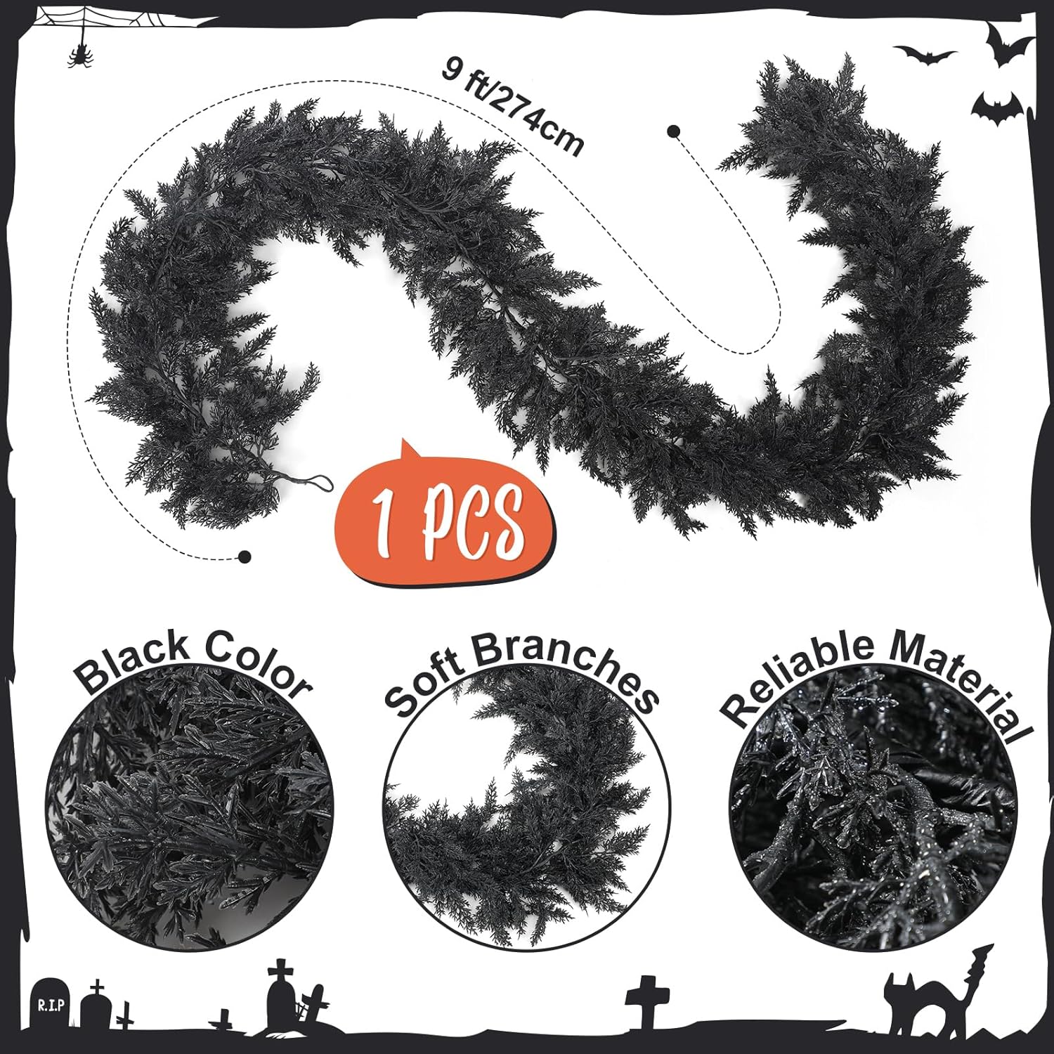 - Suitable Length: Measuring a generous 9 feet, this black cedar garland allows flexible decorating options - wrap it around stair railings, layer it across long tables, or hang it along porch railing to amplify your Halloween décor