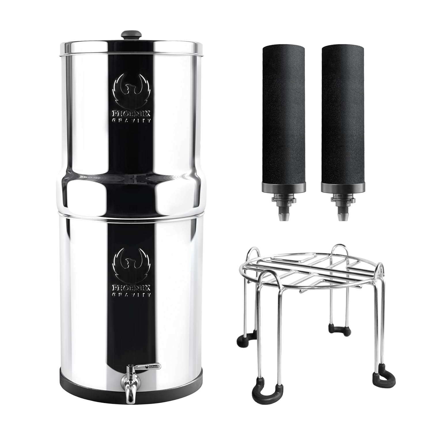 - ๐๐ฅ๐ฅ-๐๐ง-๐๐ง๐ ๐๐จ๐ฅ๐ฎ๐ญ๐ข๐จ๐ง - The Phoenix Gravity system comes complete with an AISI 304 stainless steel tank, 2 Smart Carbon (Black) filter elements, a user-friendly AISI 304 stainless steel stand and Spigot, and all necessary components for easy assembly, making it ready to use right out of the box.