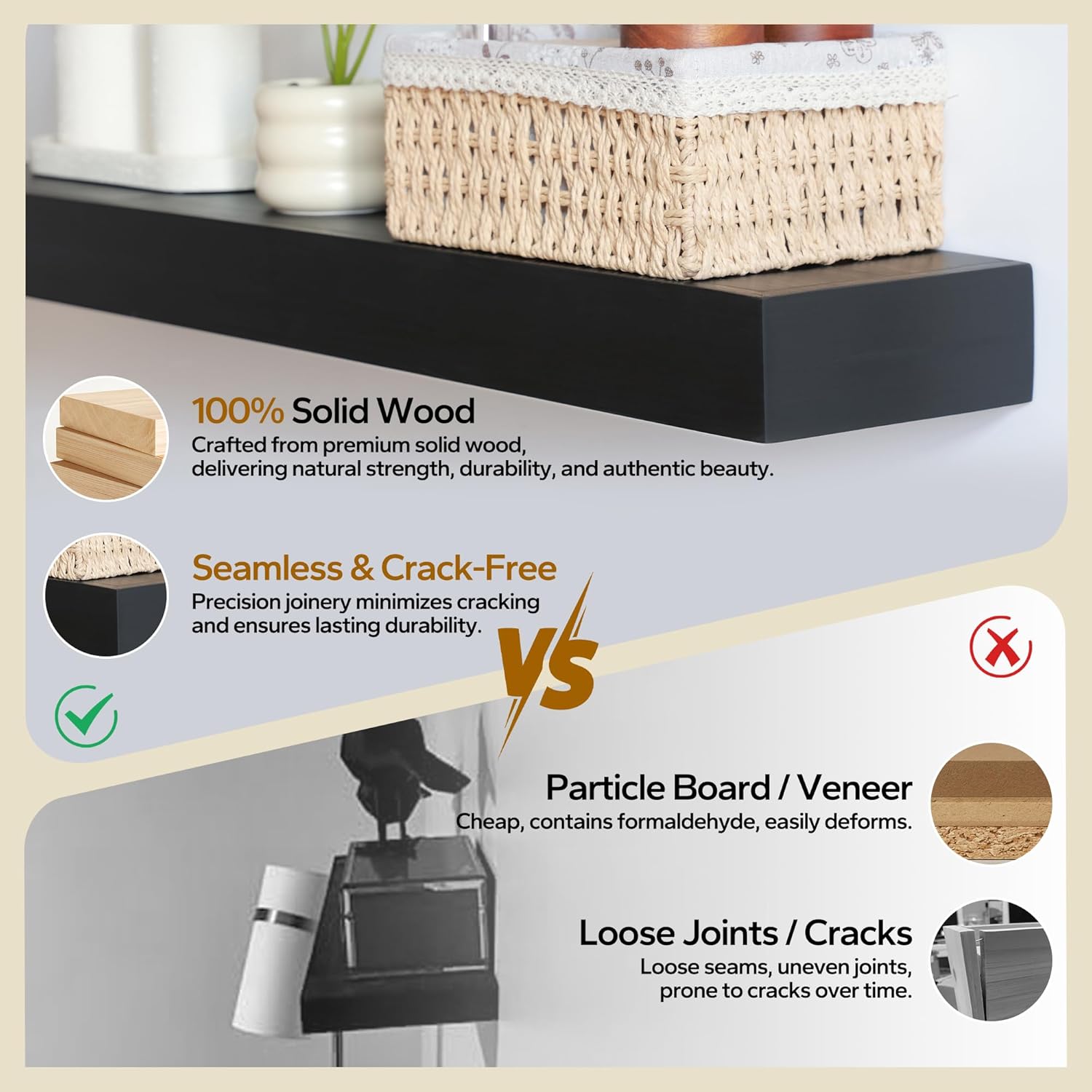 - Every Shelf Is One of a Kind: Each minimalist shelf is carefully handpicked and uniquely crafted. Due to the natural variations in wood grain, patterns, knots, and textures, the color may slightly differ from the sample shown. We strive to match the displayed sample as closely as possible.