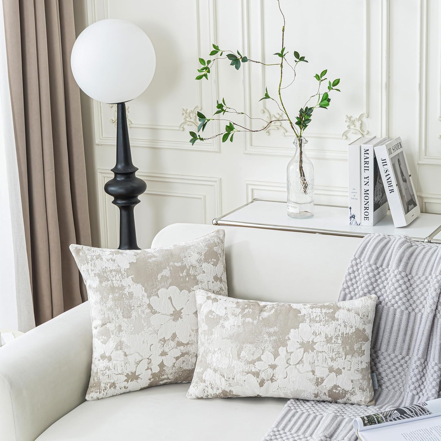 Jacquard Throw Pillow Covers 12x20 Inch Set of 2 - Vintage Floral Boho Pillow Cases with Botanical Pattern | Farmhouse Decor for Couch | Soft Textured Neutral Trio Light Khaki Warm Beige 12" x 20"