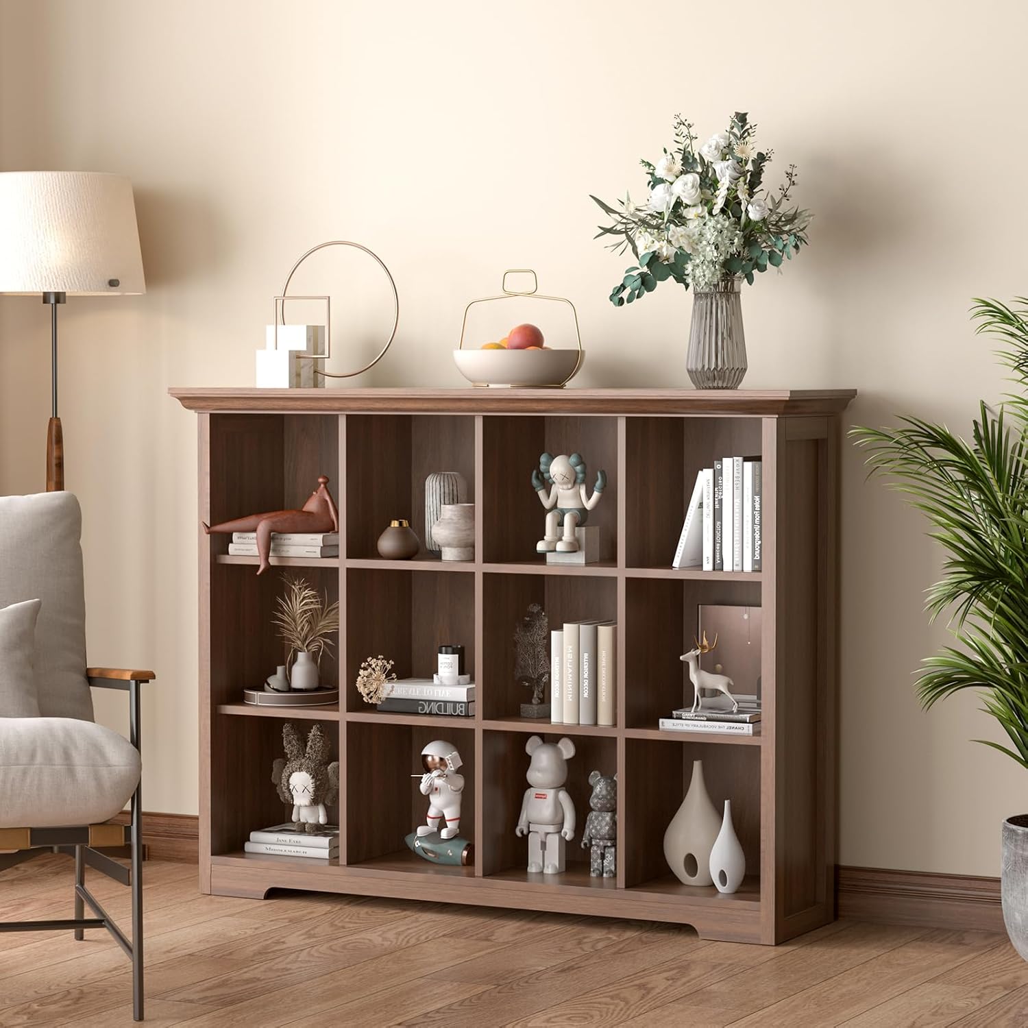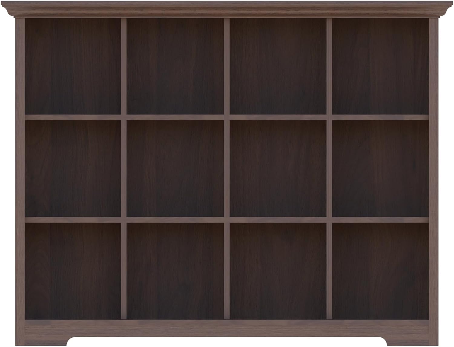 Cube Shelf Bookcase with Base - Wooden 3 Tiers Floor Standing Low Storage Cabinet for Home and Office, 12-Cube Lattice Bookshelf, Walnut