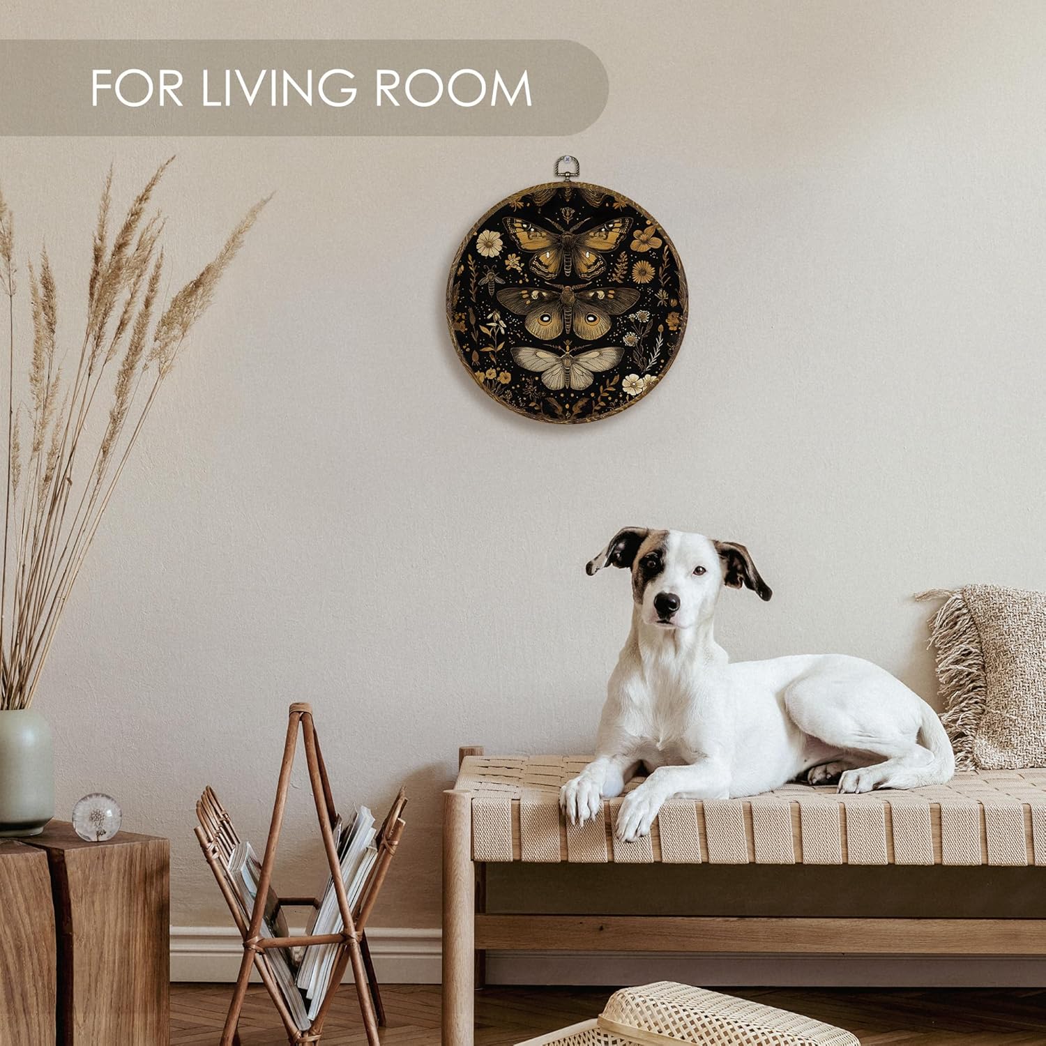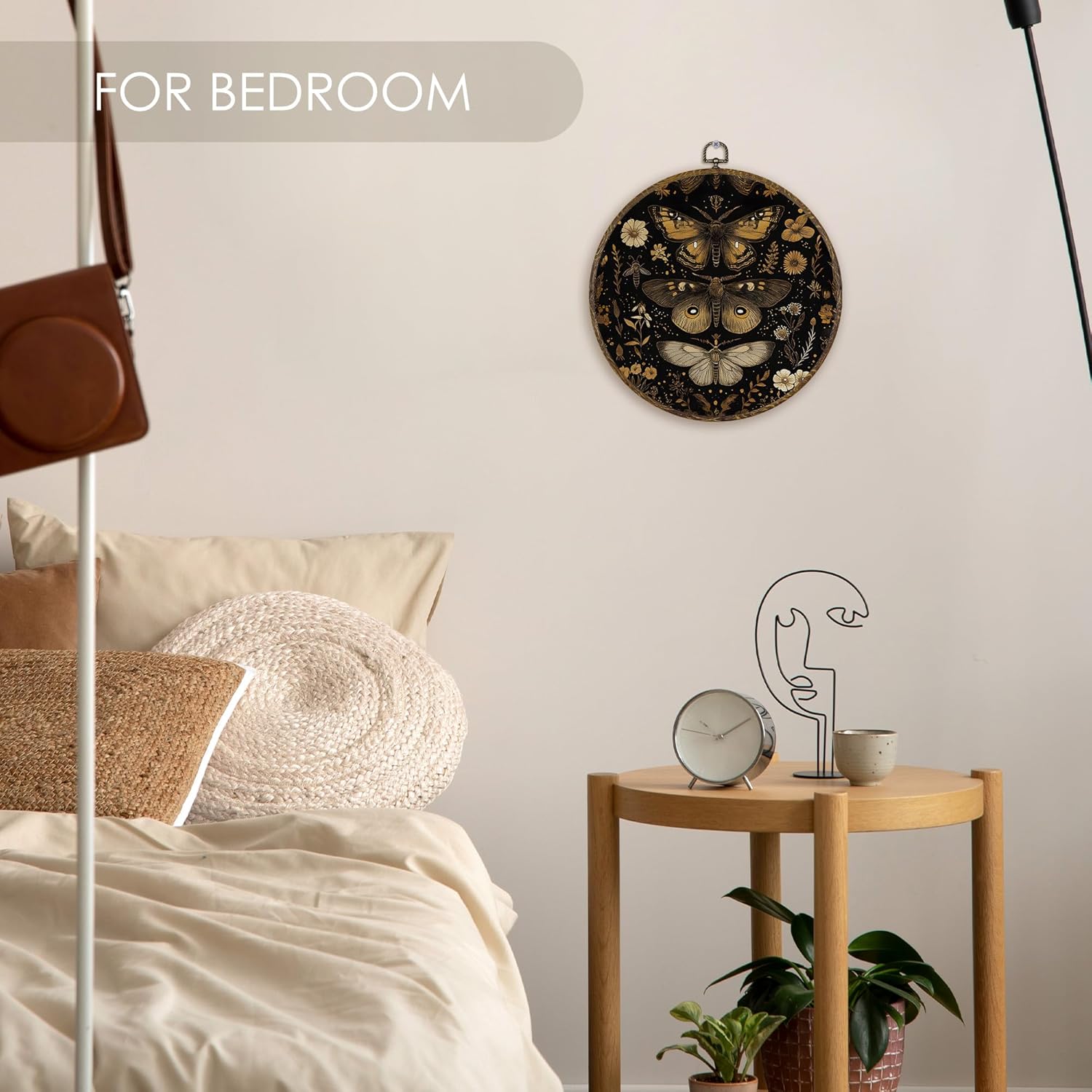 Fewgb Black Gothic Moth Round Wall Art Decor Framed for Gallery Bedroom Living Room Bathroom, Dark Witchy Butterfly Flower Canvas Wall Art Prints Picture, Moody Floral Hanging Room Decor Artwork 10x10