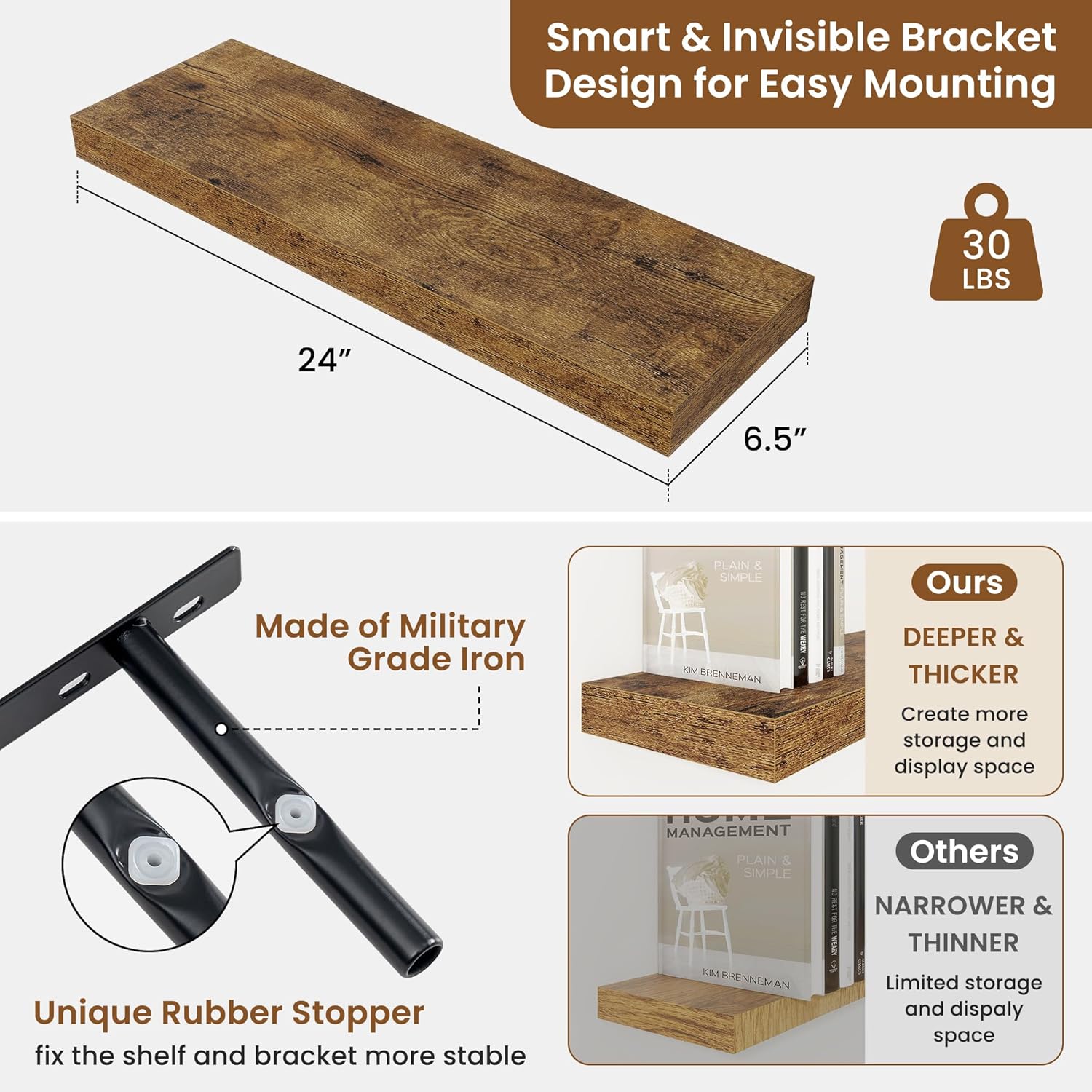 - Well-designed Floating Shelves: Our floating shelves for wall are made of premium engineered wood with a realistic wood grain finish. The rustic wood grain adds warmth and character to any modern or traditional interior. It can organize everyday clutter and make your space tidier, and make it full of aesthetic flare