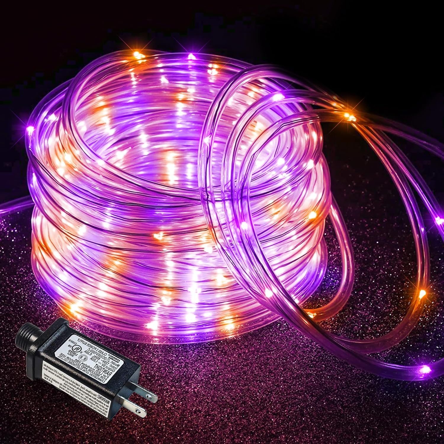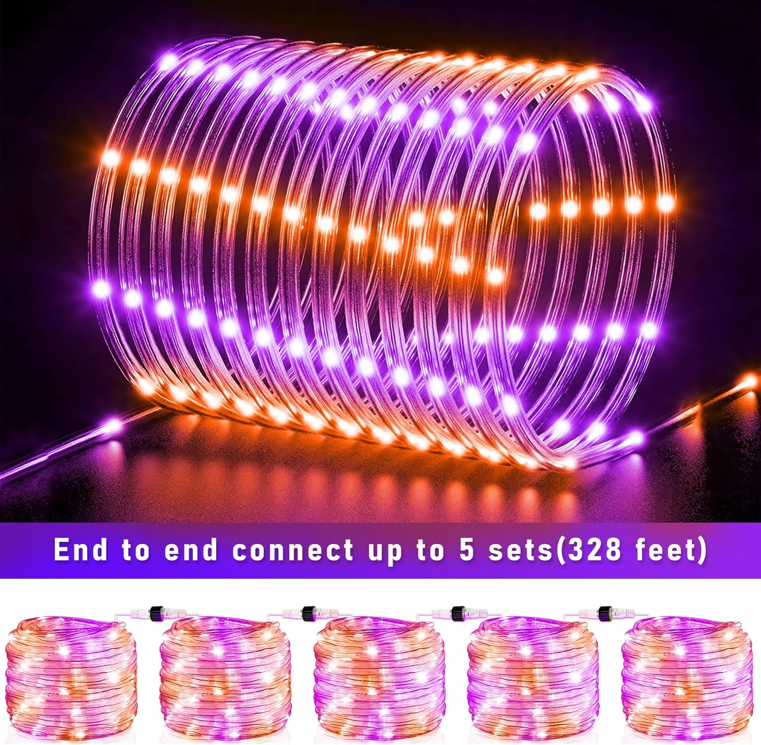 - ăUpgraded Connectable Rope Lightsă- Our rope lights for outside feature a 66ft lighting length with a 6.6ft lead wire, total 72.6ft length. LED bulbs are spaced 4 inches apart to provide bright and soft lighting. The purple orange Halloween lights can be connected end to end up to 5 sets, long enough to meet your creative lighting decor needs.