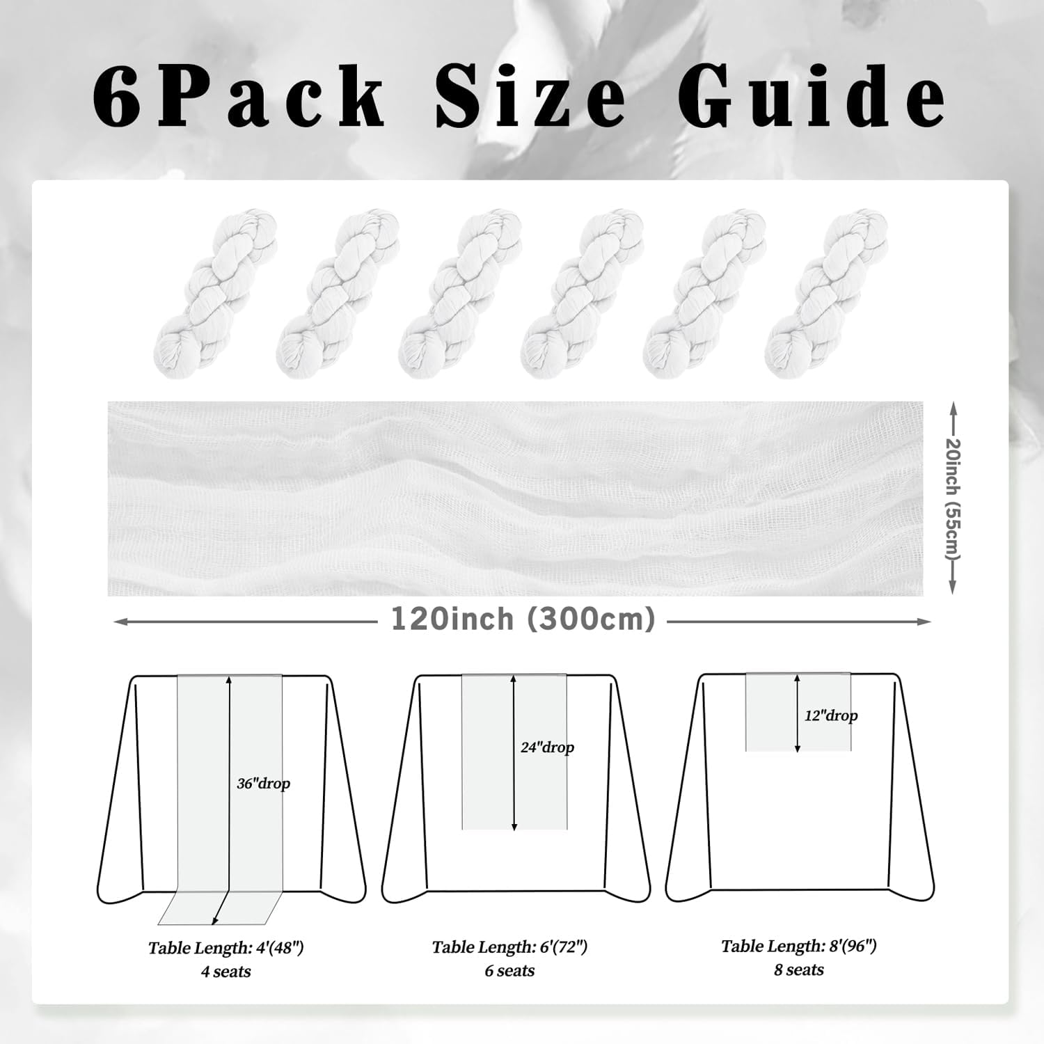 - Cheesecloth Table Runner Size: You will receive 6 white cheesecloth tablerunner, each measuring 20 x 120 inches. The quantity is sufficient for you to decorate various romantic occasions. It can decorate most shaped tables, such as rectangular tables, round tables, and cocktail tables. It is long enough to decorate a large table and be placed perfectly and elegantly on the tabletop, adding a romantic atmosphere to your occasion.