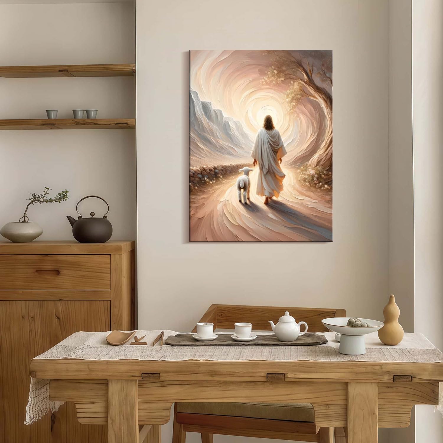 - Inspirational Religious Imagery This canvas wall art features Jesus walking peacefully with a lamb along a divine path, symbolizing guidance, compassion, and spiritual protection. A powerful expression of faith and serenity.