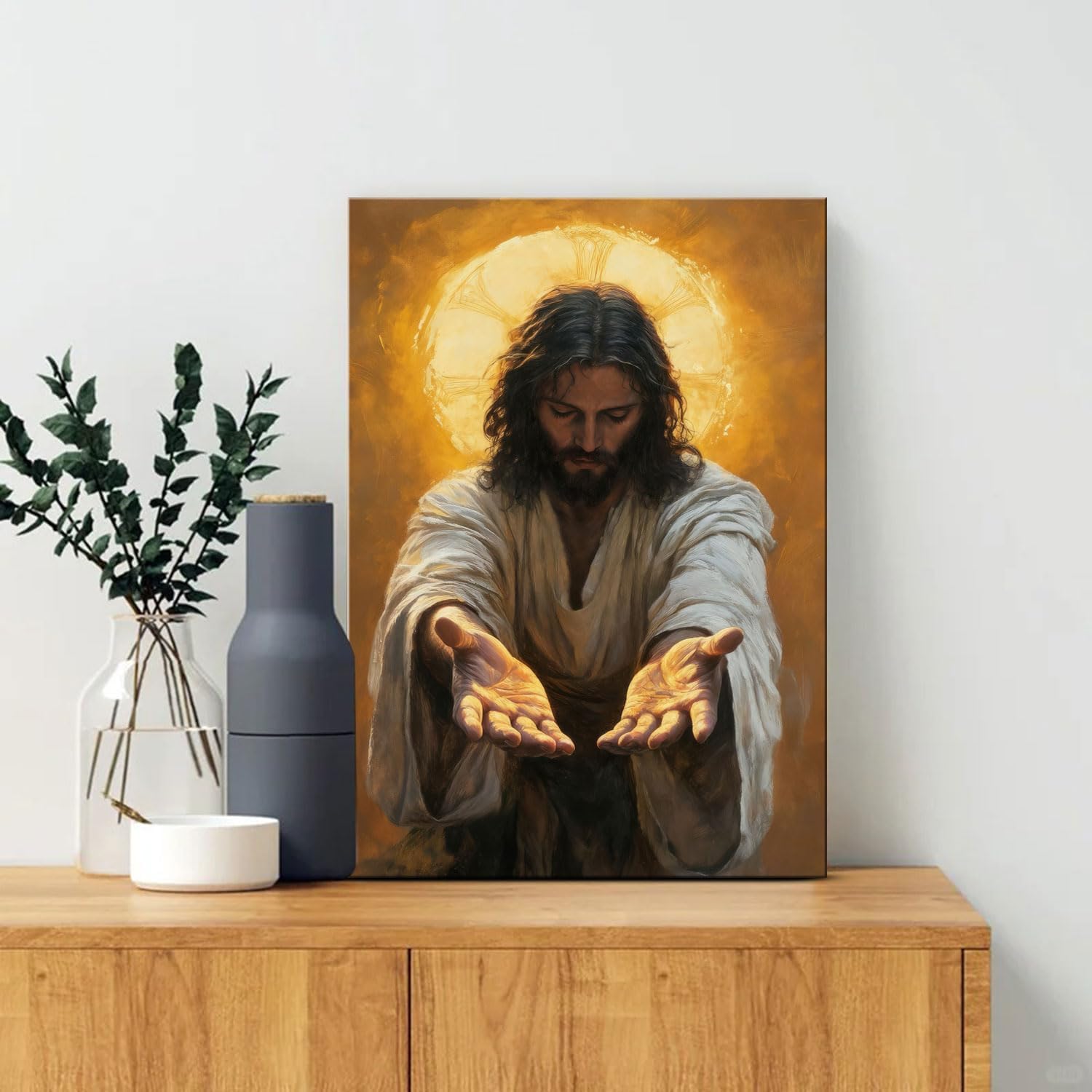 - Spiritual Christian Wall Art This 12x16 inch framed canvas print features a powerful image of Jesus Christ reaching out with open hands, set against a radiant golden halo, bringing a sense of peace and divine presence to any room.
