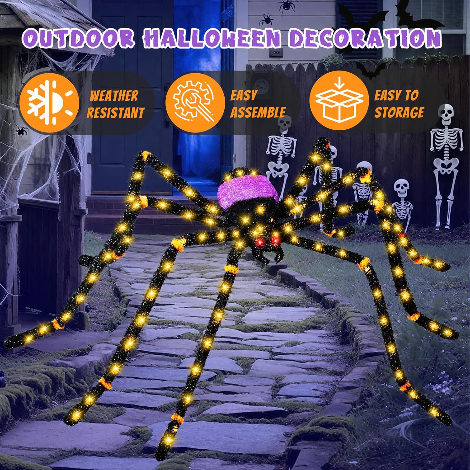 - đź•· Realistic Hairy Giant Spider: Spanning a massive 66-86 inches when extended, our ultra-lifelike giant spider Halloween decorations features hairy texture and scary glowing red eyes to dominate gardens, front yards, or hung securely on exterior walls.