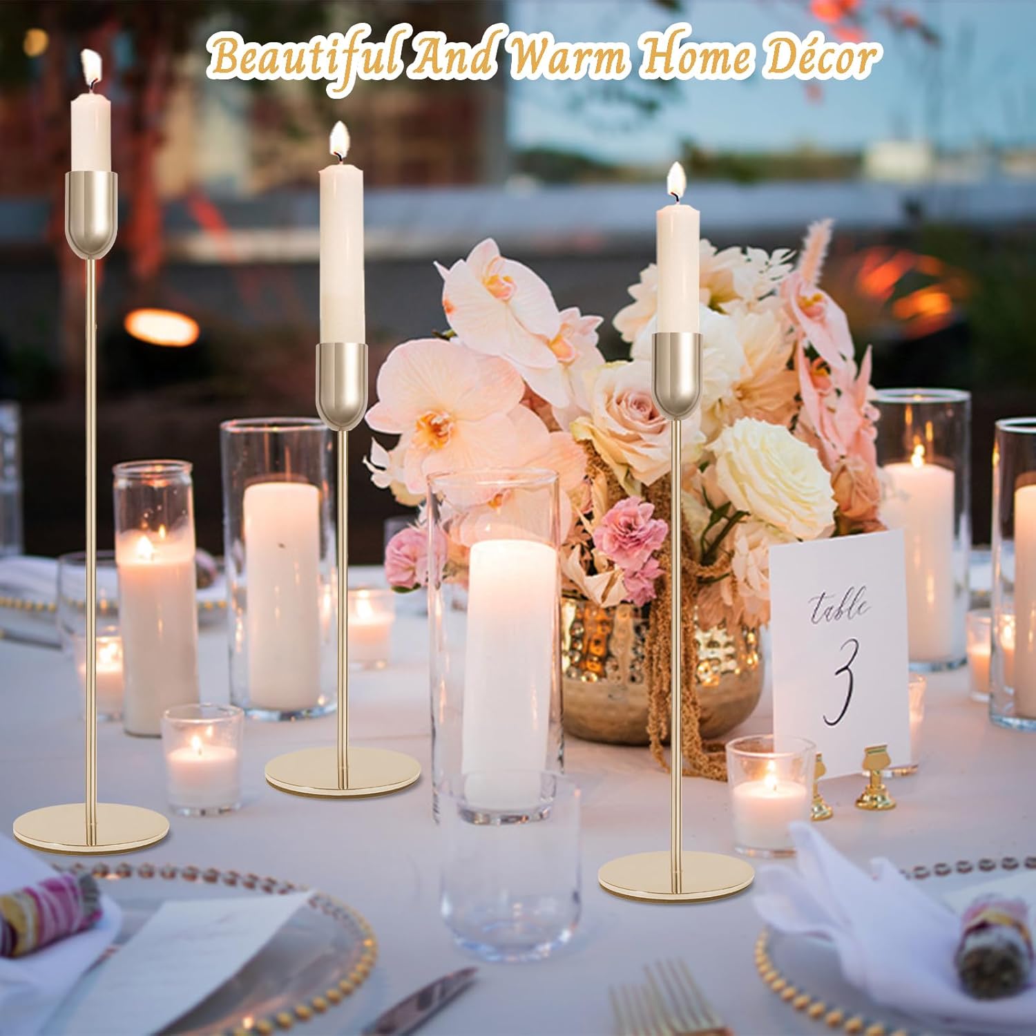 - [Abundant Set] There are 3 sizes of candlestick holders, 6 pieces of each size, a total of 18 sets, sufficient quantity, can fully meet your daily use and various party decoration needs; Note: The set does not include candles.