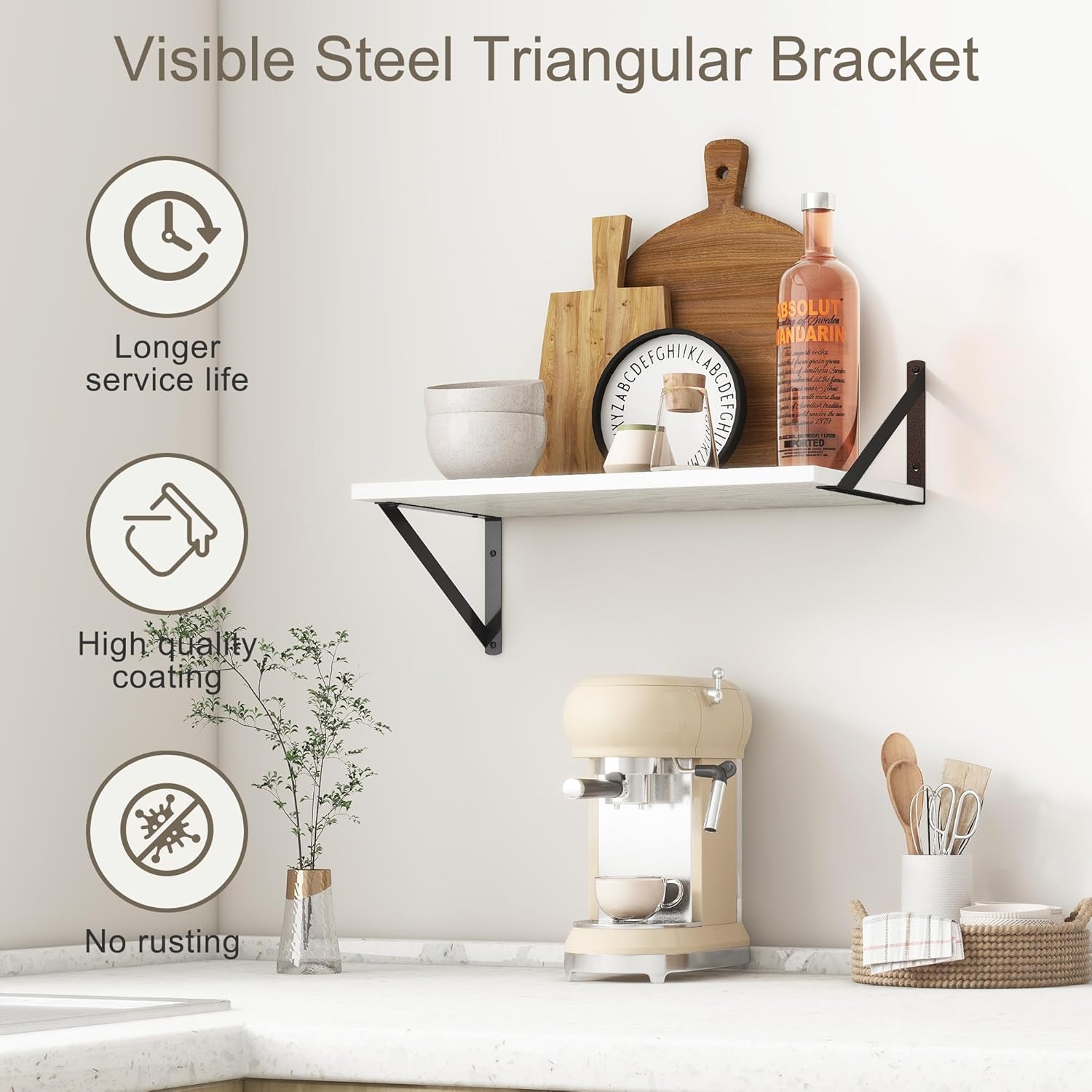 - ăDECORATIVE & FUNCTIONALăThe wall-mounted floating shelves are designed for decoration and storage, utilizing and decorating any space in your home. Used as shelf decor to show your collection, books, or prize, the hanging shelves are perfect for displaying your photo frame, small plants, model, or audio in your living room, office, study. And can also use as over the toilet storage shelf in the bathroom to hold toiletries or used as kitchen shelf to storage condiments.