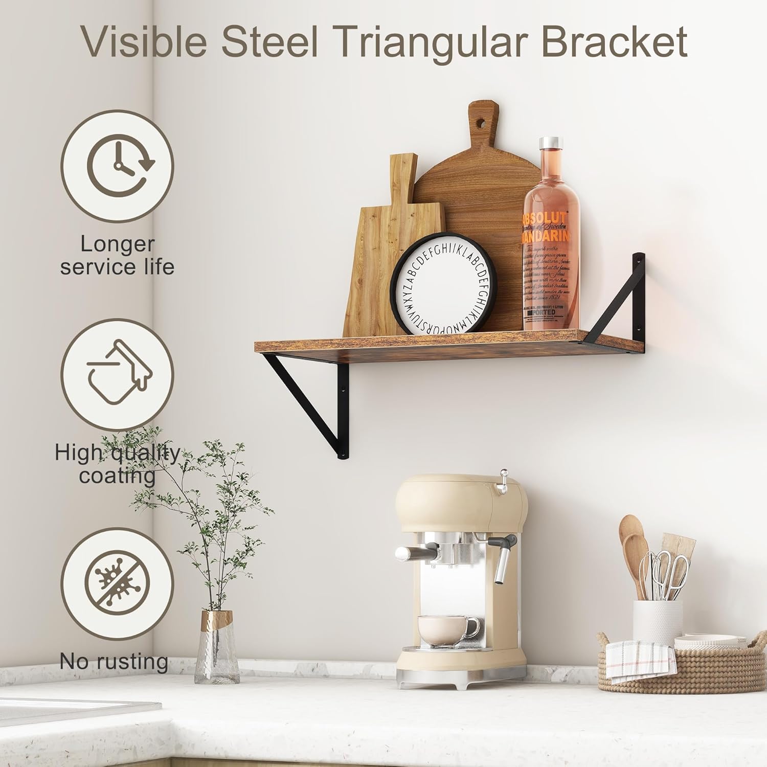 - ăFARMHOUSE RUSTIC WALL SHELFăThese floating shelves are made of premium engineered wood board and visible triangular bracket. The rustic wooden grain surface add character and warmth to any modern or traditional interior with these deep floating shelves, contrast shelves at staggering heights on the wall or mount side-by-side or in the corner for a clean streamlined look.
