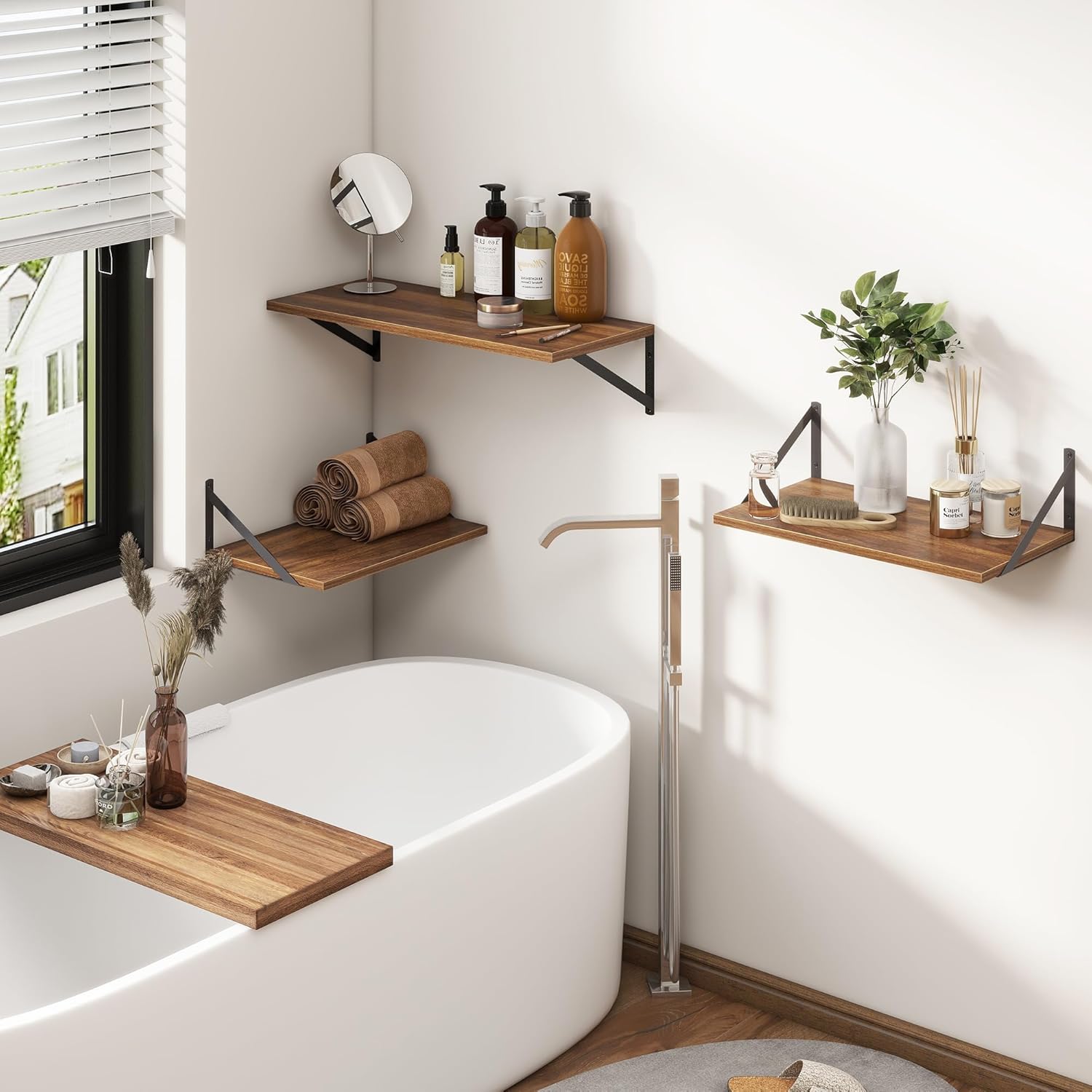 - ăFARMHOUSE RUSTIC WALL SHELFăThese floating shelves are made of premium engineered wood board and visible triangular bracket. The rustic wooden grain surface add character and warmth to any modern or traditional interior with these deep floating shelves, contrast shelves at staggering heights on the wall or mount side-by-side or in the corner for a clean streamlined look.