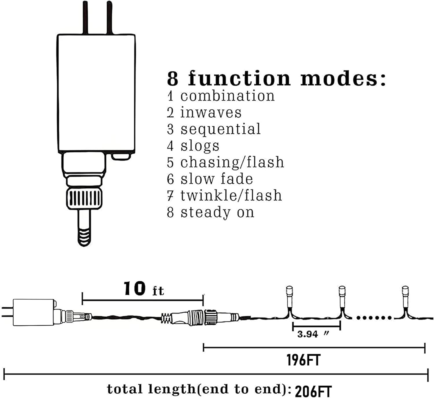 - Details: This Halloween string light set comprises 600 LED bulbs. It features a 10 ft leading wire and a 196 ft light string, making the overall length 206 ft. With a bulb spacing of 3.9 inches, it can create a lively and eerie ambiance for your Halloween party or decoration
