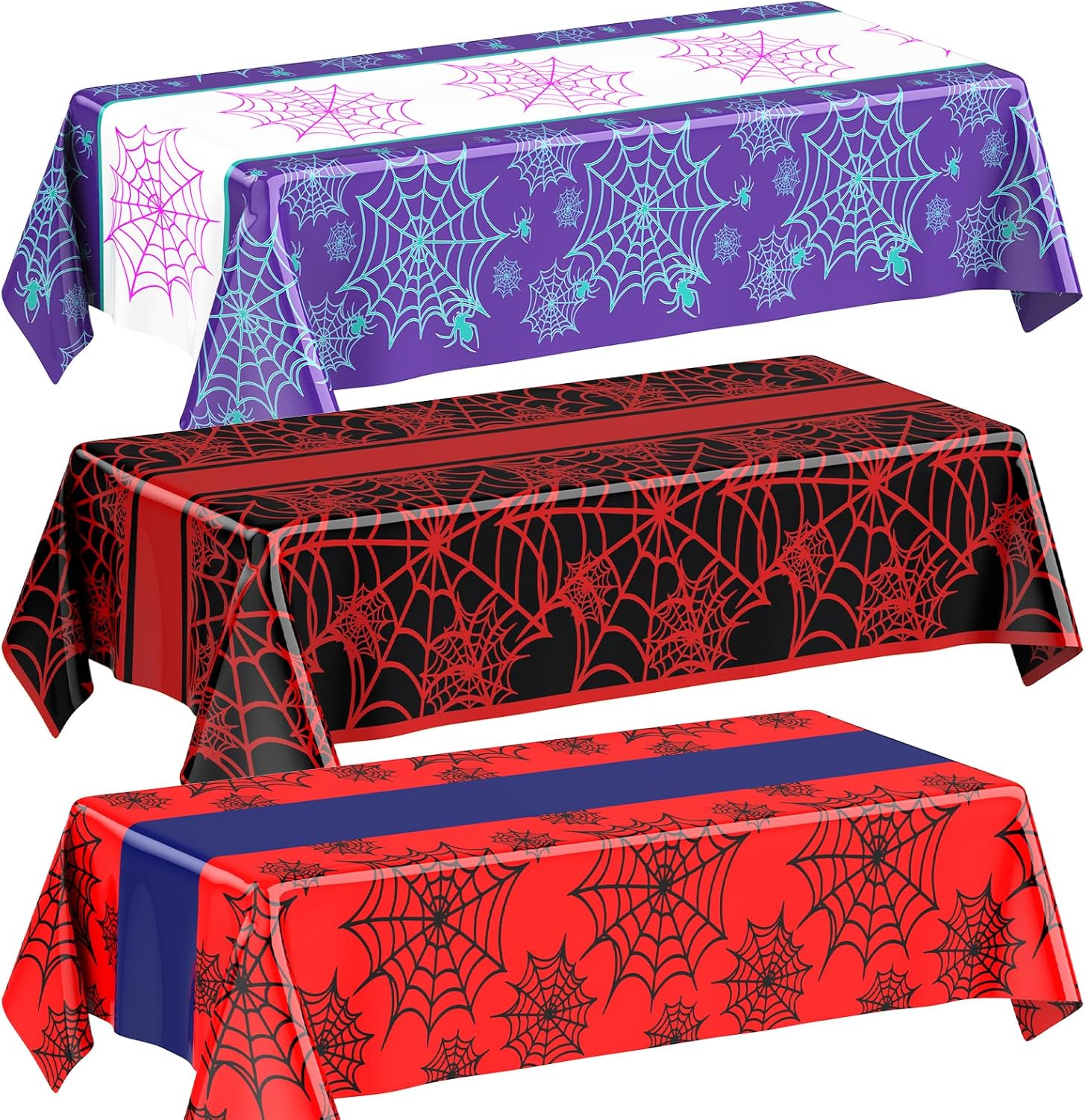 Oudain 3 Pack Spider Theme Birthday Decorations Halloween Purple Black Red Pink Green Web Ghost Bat Tablecloth Cartoon Table Cover Party Favor for Birthday (Purple,Black,Red,Spider)