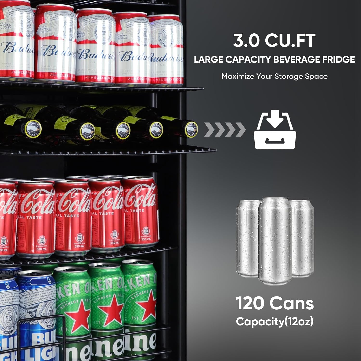 - SPACIOUS BEVERAGE STORAGE - The ORYMUSE beverage refrigerator is designed for optimal capacity and organization. It features four shelves with eight dedicated storage zones, accommodating up to 120 standard 12 oz cans. Whether storing craft beer, soda, or bottled water, its generous interior ensures efficient cooling and easy access to a wide variety of drinks