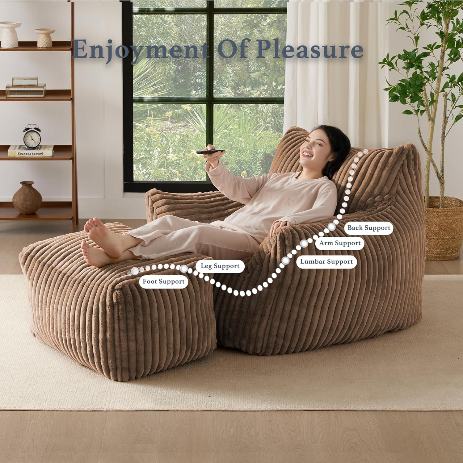- Ultimate Comfort: Filled with high-resilience shredded foam, this oversized bean bag chair with footstool chaise offers a unique blend of softness, support, and a snug, cocoon-like feel. Perfect for lounging, reading, or using as a comfy gaming chair, it’s designed to elevate your relaxation experience.