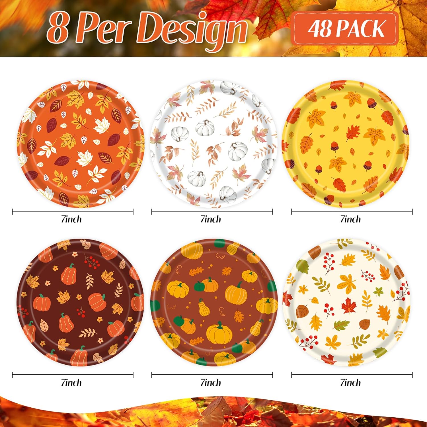 - 🍂【Package Includes】 You'll receive 48 festive fall-themed paper plates, perfect for autumn gatherings. Each set features 6 unique designs, with 8 plates per design, adding variety to your table setting.