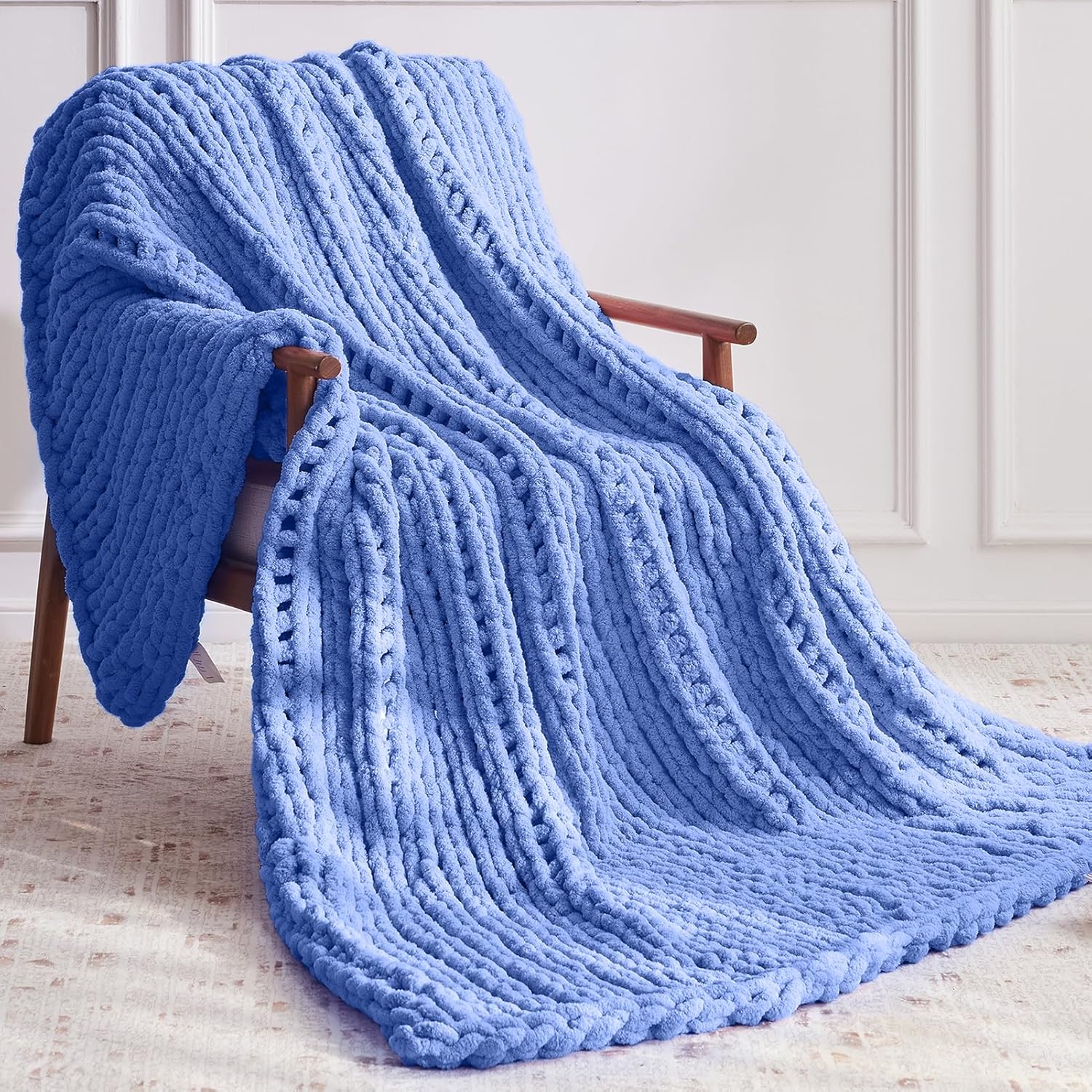 Chunky Knit Throw Blanket, 60''*80'' Knitted Throw Chenille Yarn for Bed Couch, Handmade Light Blue Crochet Big Thick Blanket, Machine Washable Cute Comfy Blanket for Home Decor