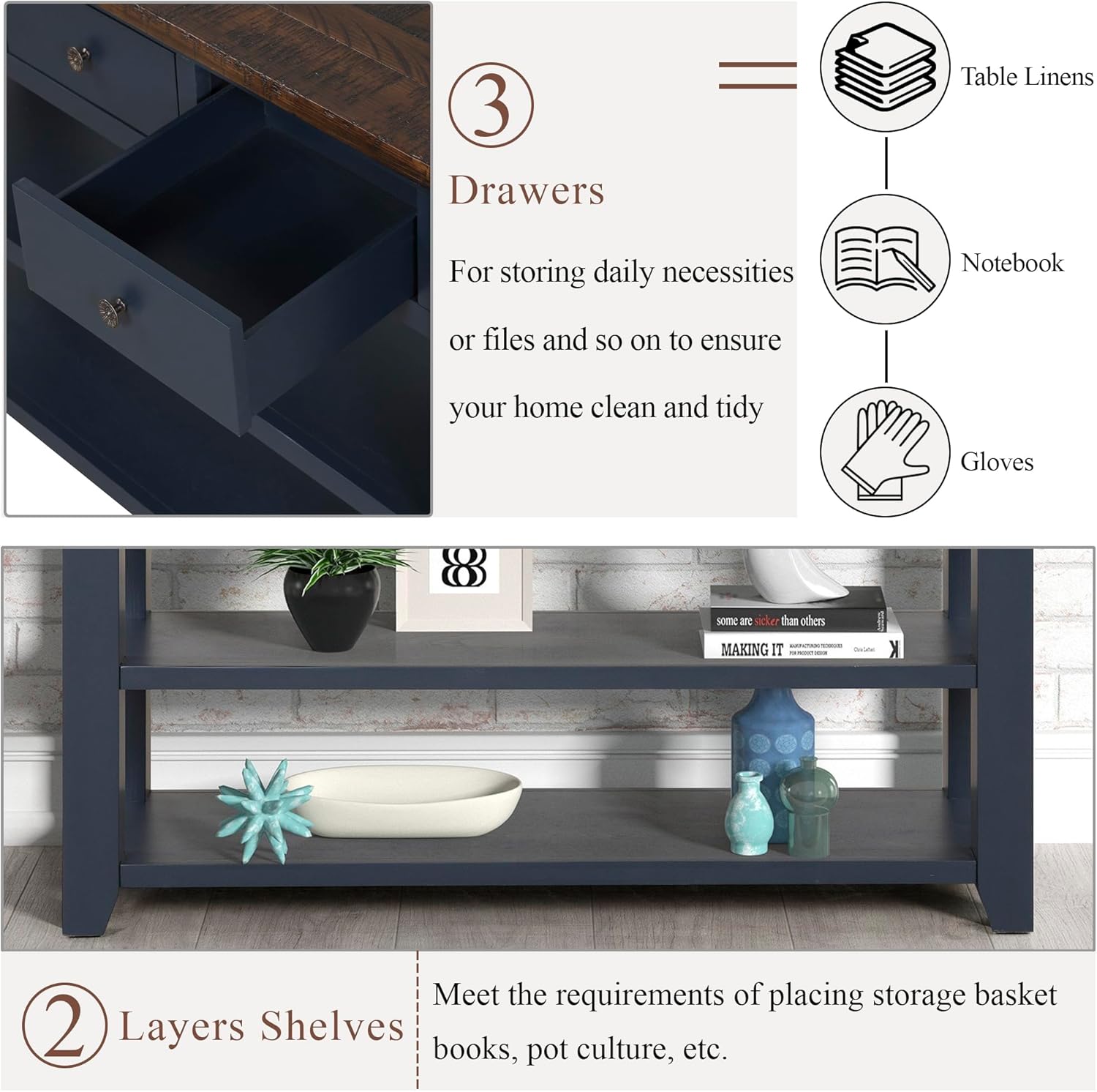 Farmhouse Wood Entry Console Table 48-Inch Modern Sofa Entryway Table with Drawers and Storage Shelves for Entrance Living Room (Blue)