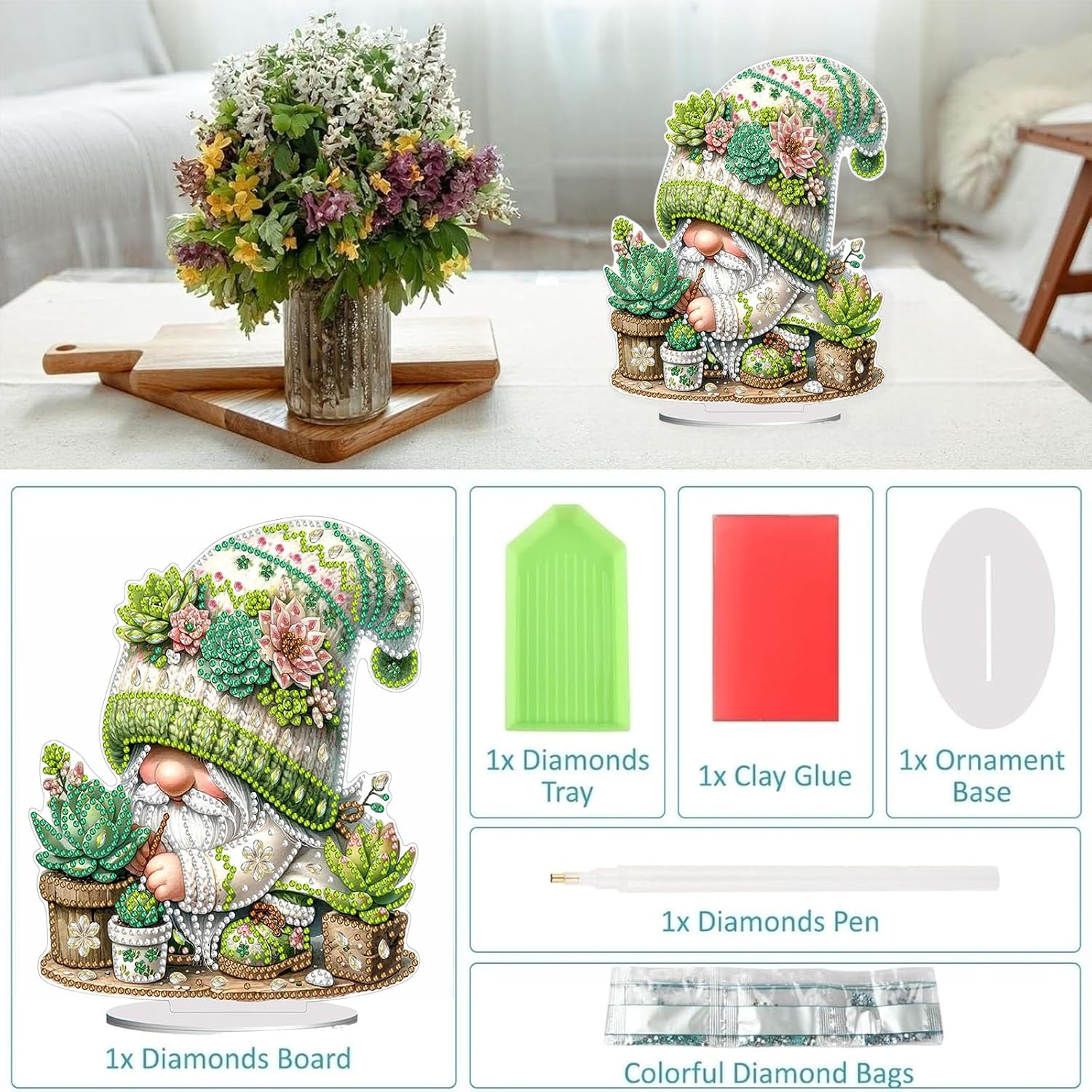 - 【DIY Diamond Desktop Ornament】:Package of the ornament includes:1 X desktop ornament, 1 X diamond dainting tool kit (Colorful Diamond Bag, Clay Glue, Pen and Diamond Tray).
