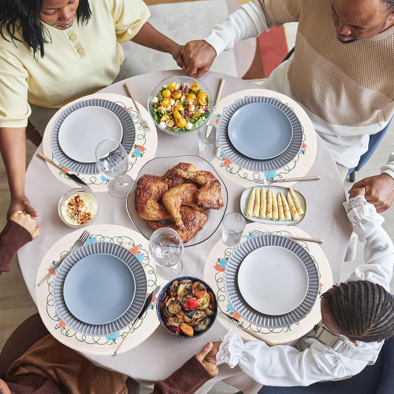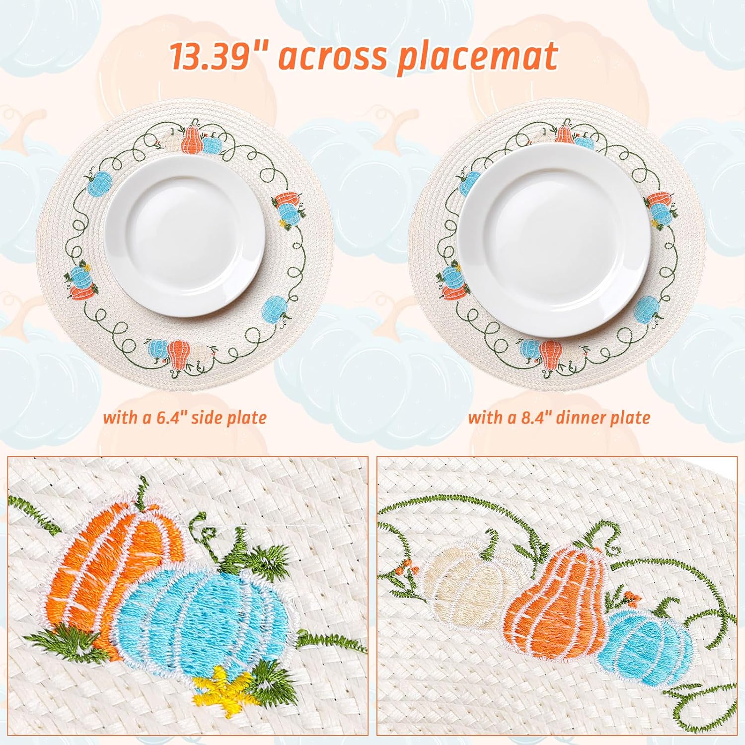 Whaline 4Pcs Round Fall Placemats Pumpkin Embroidered Place Mats Autumn Dinner Table Mats for Home Harvest Thanksgiving Holiday Party Decor