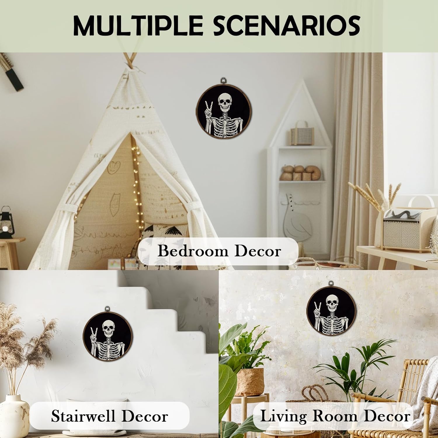 cvjutf Gothic Skeleton Wall Art Decor Framed, Dark Academia Decor, Witchy Halloween Round Wall Decor, Gothic Halloween Skull Canvas Prints Art for Gallery Bathroom Living Room, 10x10 Inch