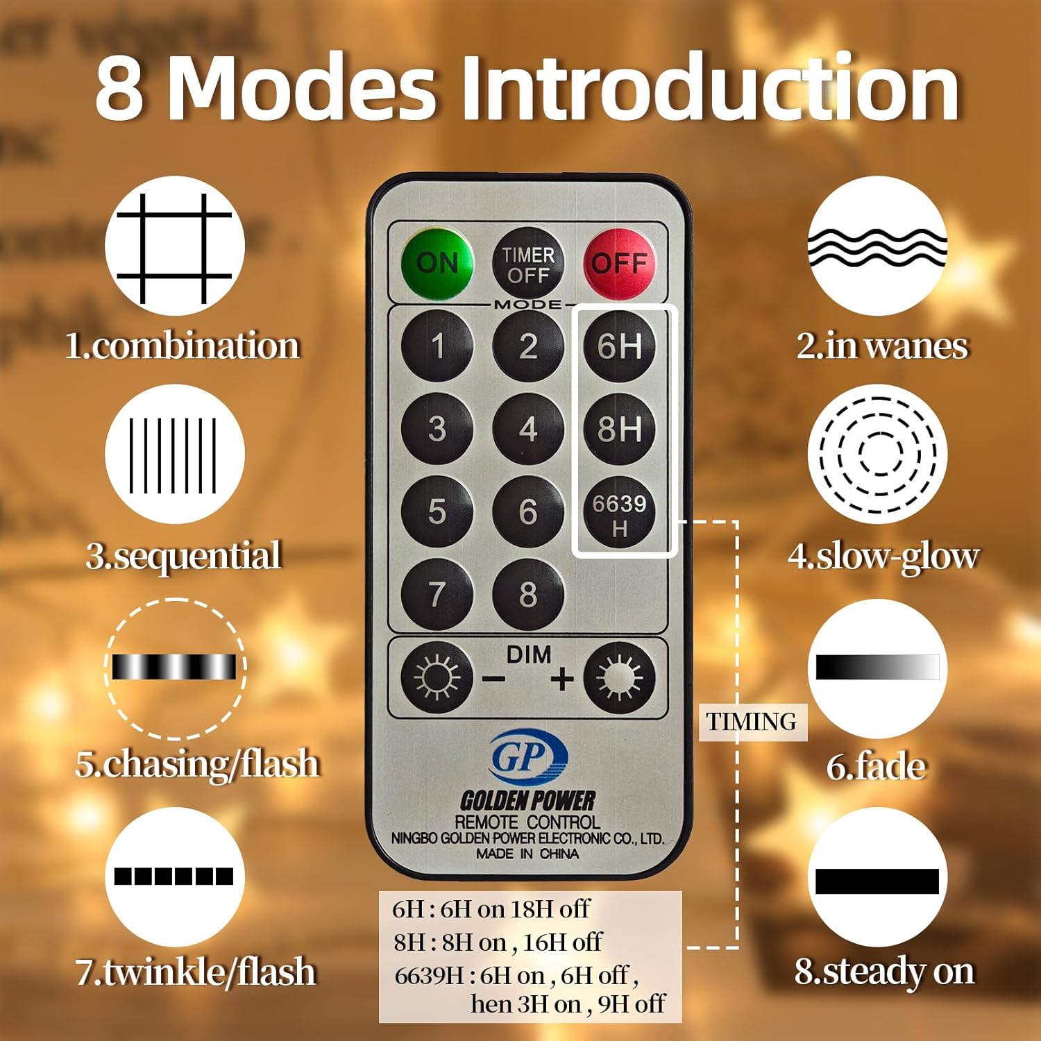 - 8-Mode Control & Smart Timer Remote:​​ Customize the mood with ​​8 distinct lighting modes​​ (memory function saves your favorite!). Set the included ​​remote-controlled timer​​ to turn your lights ​​on for 6 hours and off for 18 hours daily​​, perfect for automation and saving energy. Control it from up to ​​33 FT (10 M)​​ away, even when lights are hard to reach!