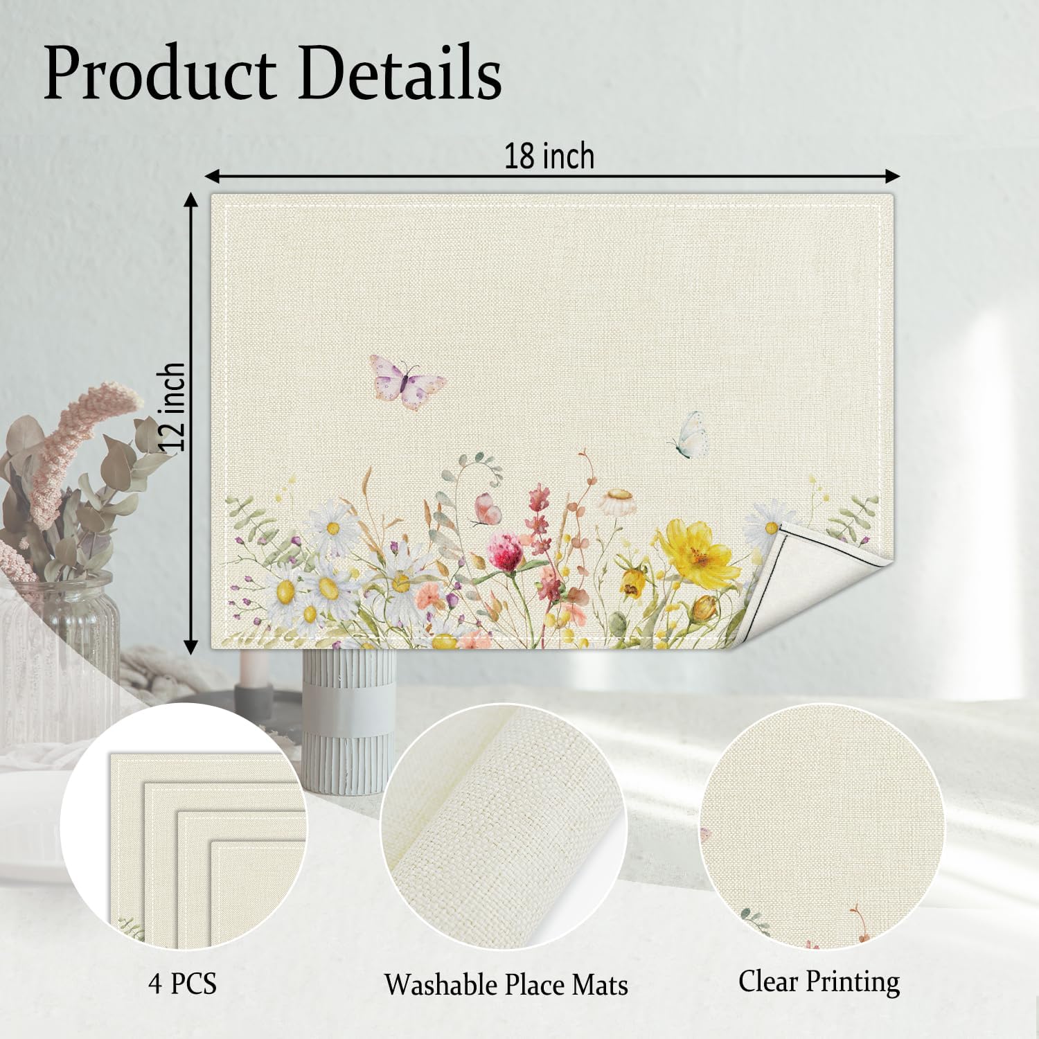 Wildflowers Placemats Set of 4, Floral Table Mat for Home Kitchen, Restaurants, Outdoor Linen Washable Place Mats 12x18 inch Party Event Dining Decoration-11