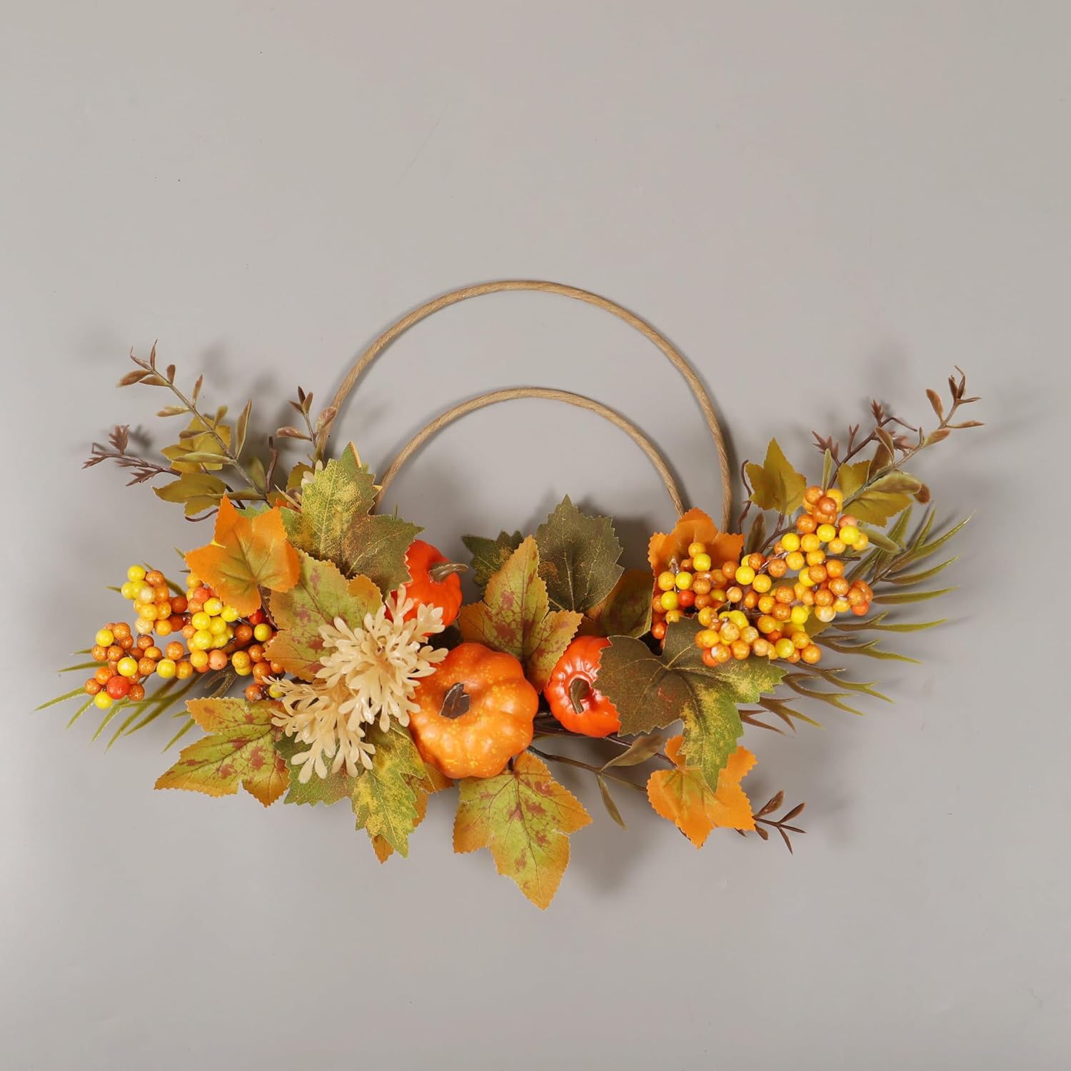 - SEASONAL DESIGN: Beautiful autumn wreath featuring realistic mini pumpkins, fall leaves, and yellow berries arranged on double metal hoops for elegant door decoration