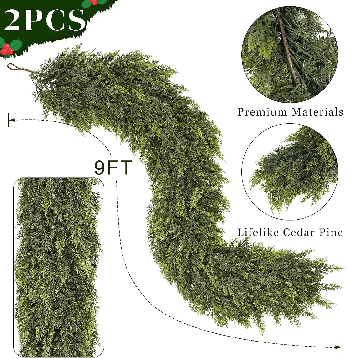 9FT Real Touch Cedar Garland for Fireplace - Artificial Christmas Garlands Realistic Faux Greenery Fake Pine Needles Garland for Holiday,Table, Window,Mantel,Stairs, Home,Indoor Outdoor Decor (2PCS)