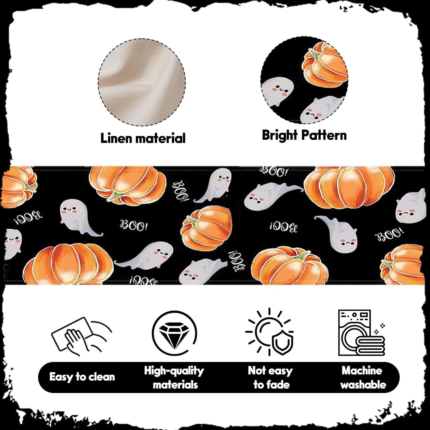 - Creating a Halloween Festive Atmosphere: This product features vivid ghost, pumpkin and ''Boo" patterns to create the perfect Halloween table decoration, suitable for party dinners and haunted house sets