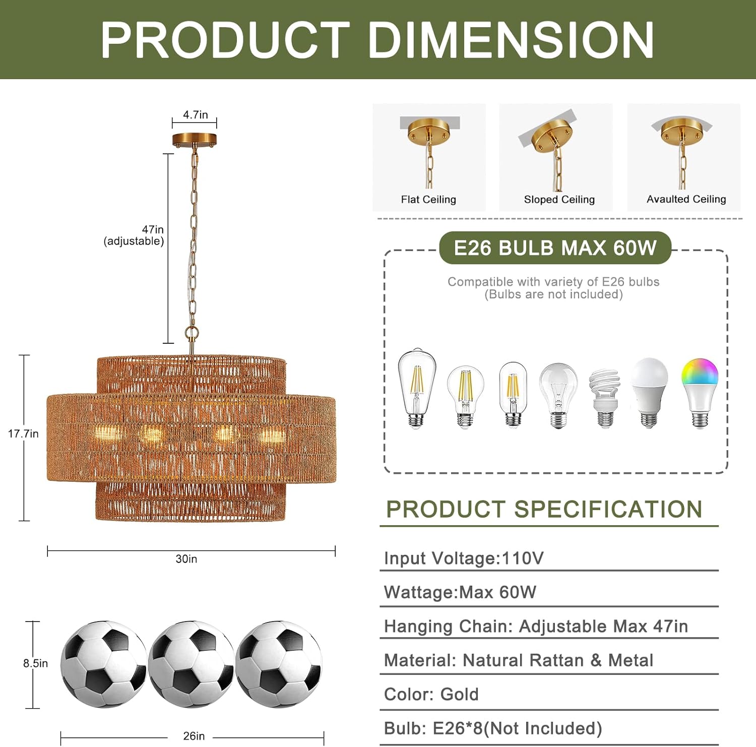 - 【Perfect Size】The boho wicker chandelier with a 30" diameter and 17.7" height. Hanging chain can be adjusted, max 53.1", allowing you to achieve the perfect lighting arrangement for your needs.
