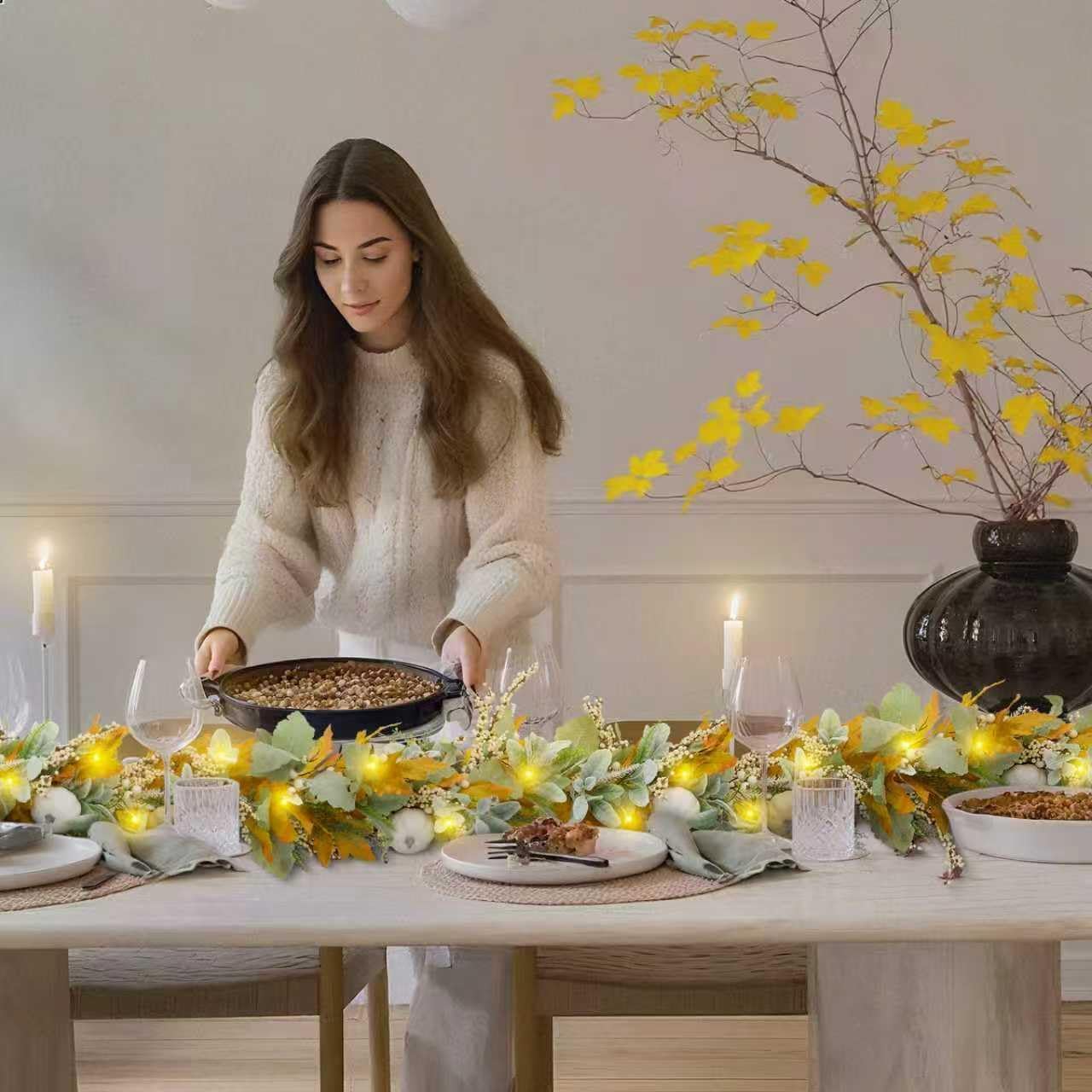 - Garland with lights: Generous garland drapes anywhere - mantels, stairs or cabinets. Glowing fairy lights add magical fall charm to any space in your home