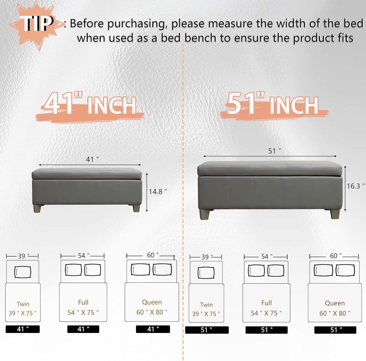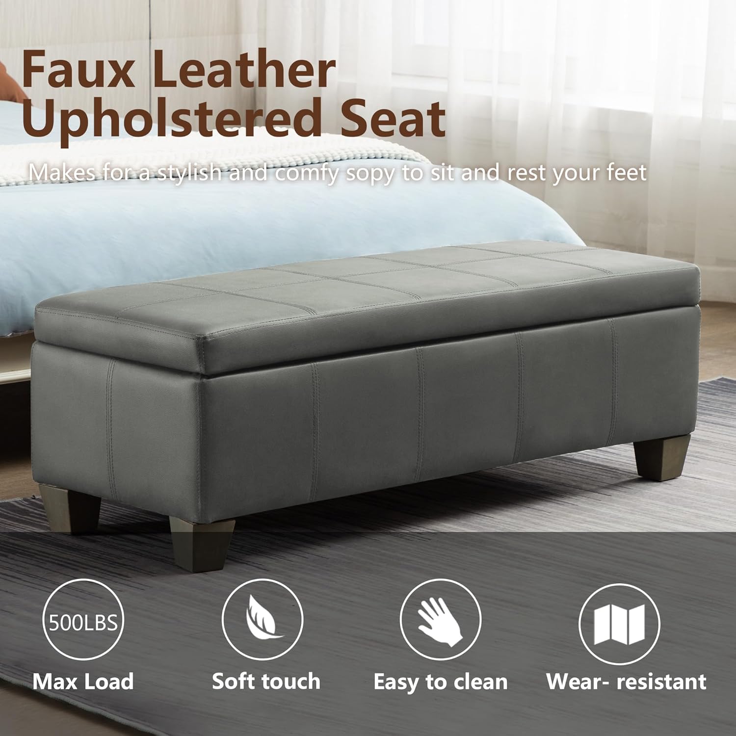 51 Inch Faux Leather Ottoman with Storage, End of Bed Bench with Large Storage, Rectangular Extra Long Bench for Bedroom and Living Room, Light Grey