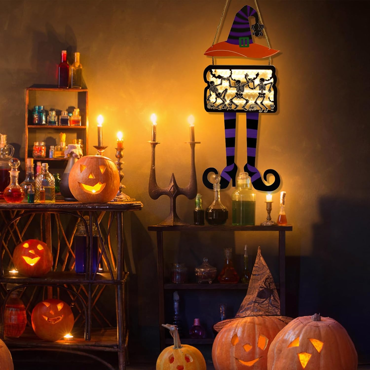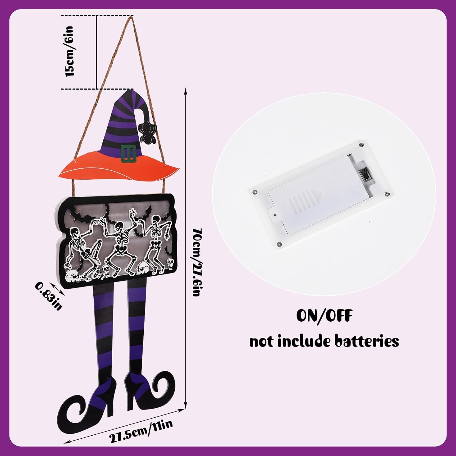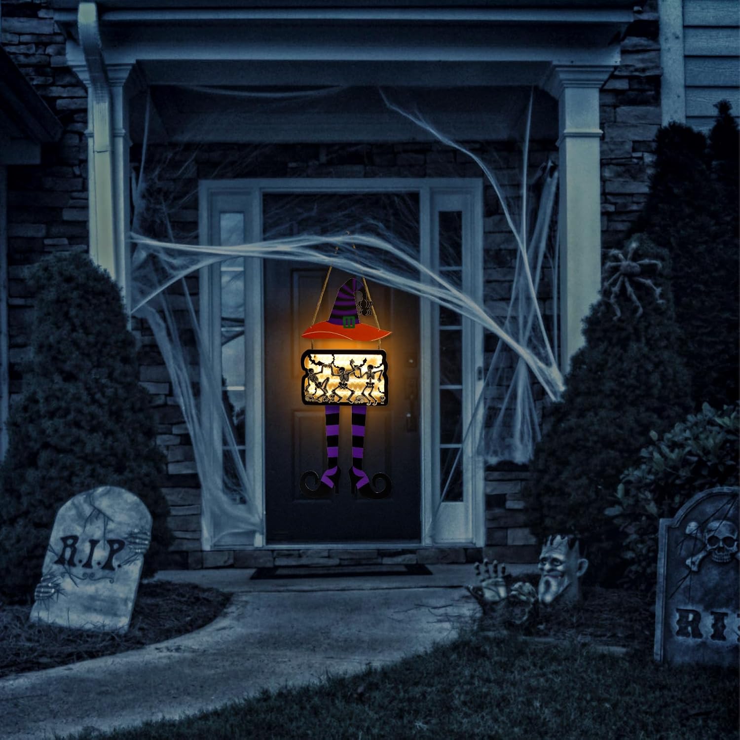 FINGOOO Halloween Door Hanging Sign, Large Witch Skeleton Halloween Door Hanger with Light for Front Door Decor