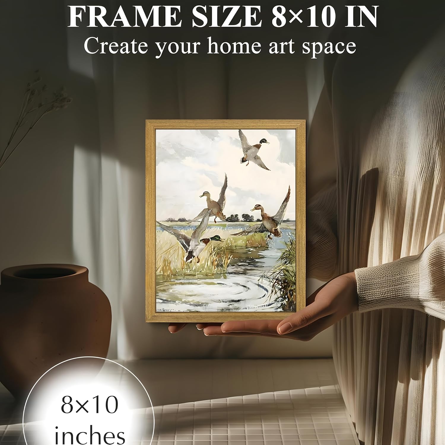 - Timeless Vintage Wildlife Artwork Features a beautifully detailed watercolor illustration of mallard ducks in flight over a peaceful marsh. This classic design blends poster appeal with artist-quality paintings, perfect for fans of wildlife art, vintage decor, and rustic living.