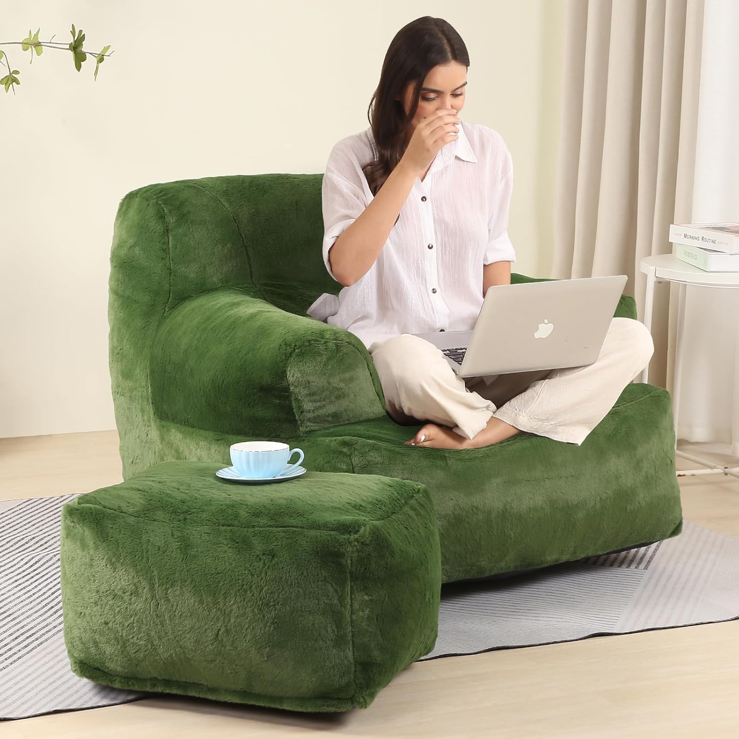 Comfy Gaint Bean Bag Chair with Ottoman, Huge Bean Bag Armchair for Adults and Teens, Green