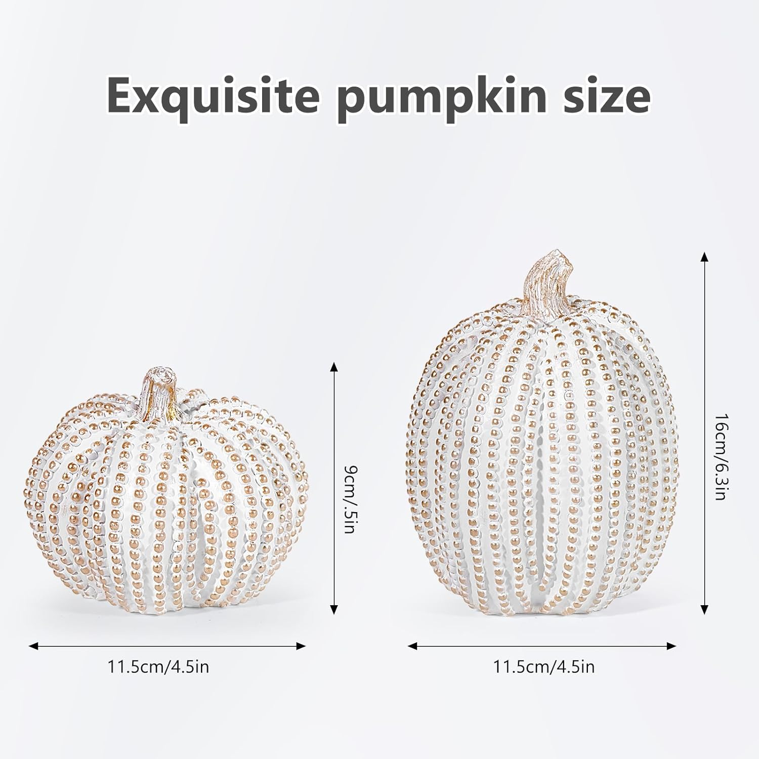 - SIZE: The three different colored resin pumpkins are different sizes. The pure white pumpkin is slightly smaller. Set C: 5.1 x 3.5 inches; Sets A and B: 6.1 x 4.5 inches; Sets A and B: 4.1 x 4.3 inches.