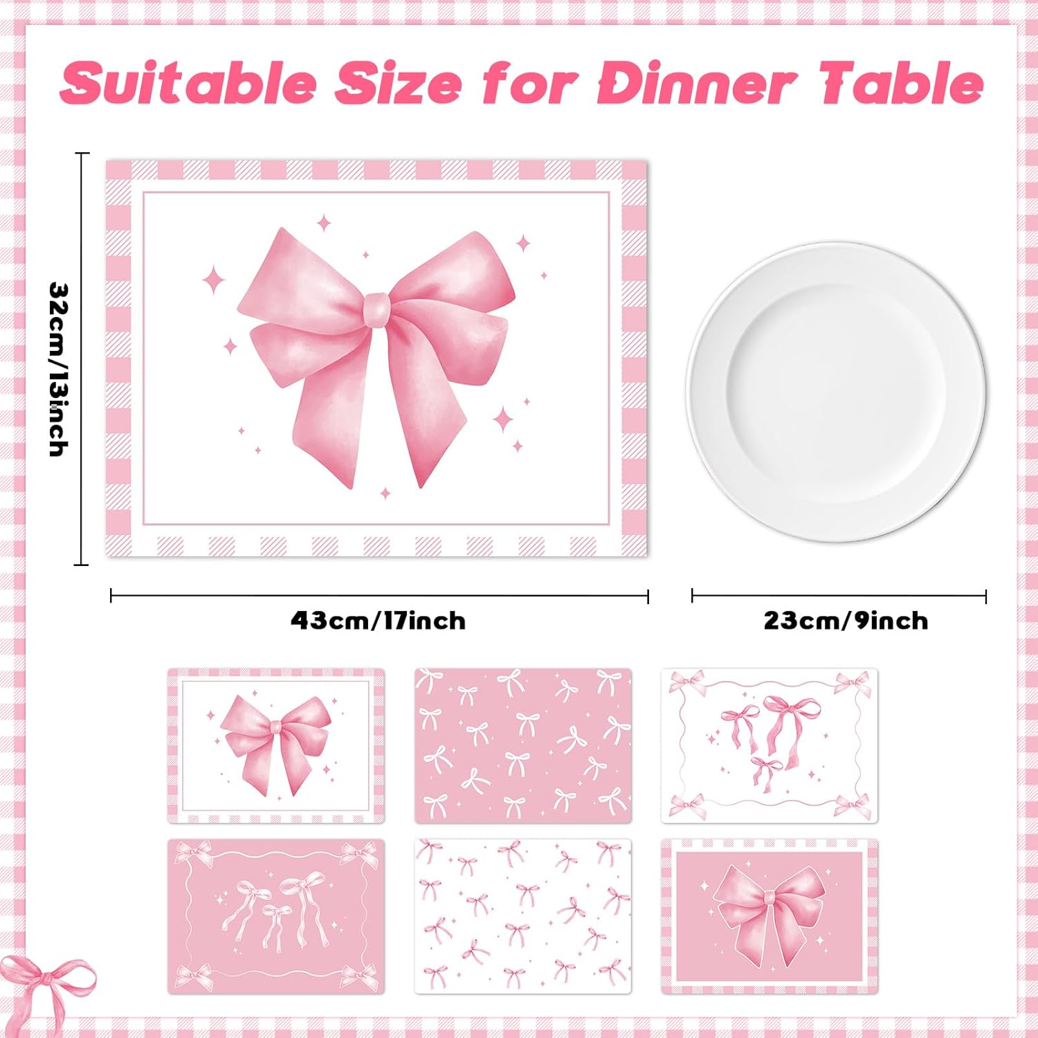 - Package Includes: Our table decoration set includes 6 pieces of pink bow place mats. Each pink ribbon bow table mat measures 19.92 x 12.59 inches, providing ample coverage to protect your tabletop from food and drink spills, ensuring your dining surface stays clean and tidy
