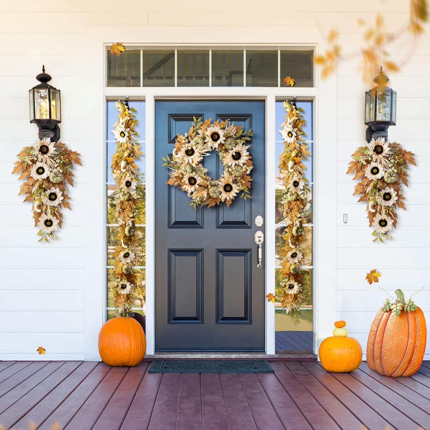 - 【Elegant Neutral Fall Wreath】Adorn your entryway with this sophisticated 24" neutral-toned wreath, featuring sunflowers, pumpkins and autumn leaves for a subtle fall wreath for front door display.