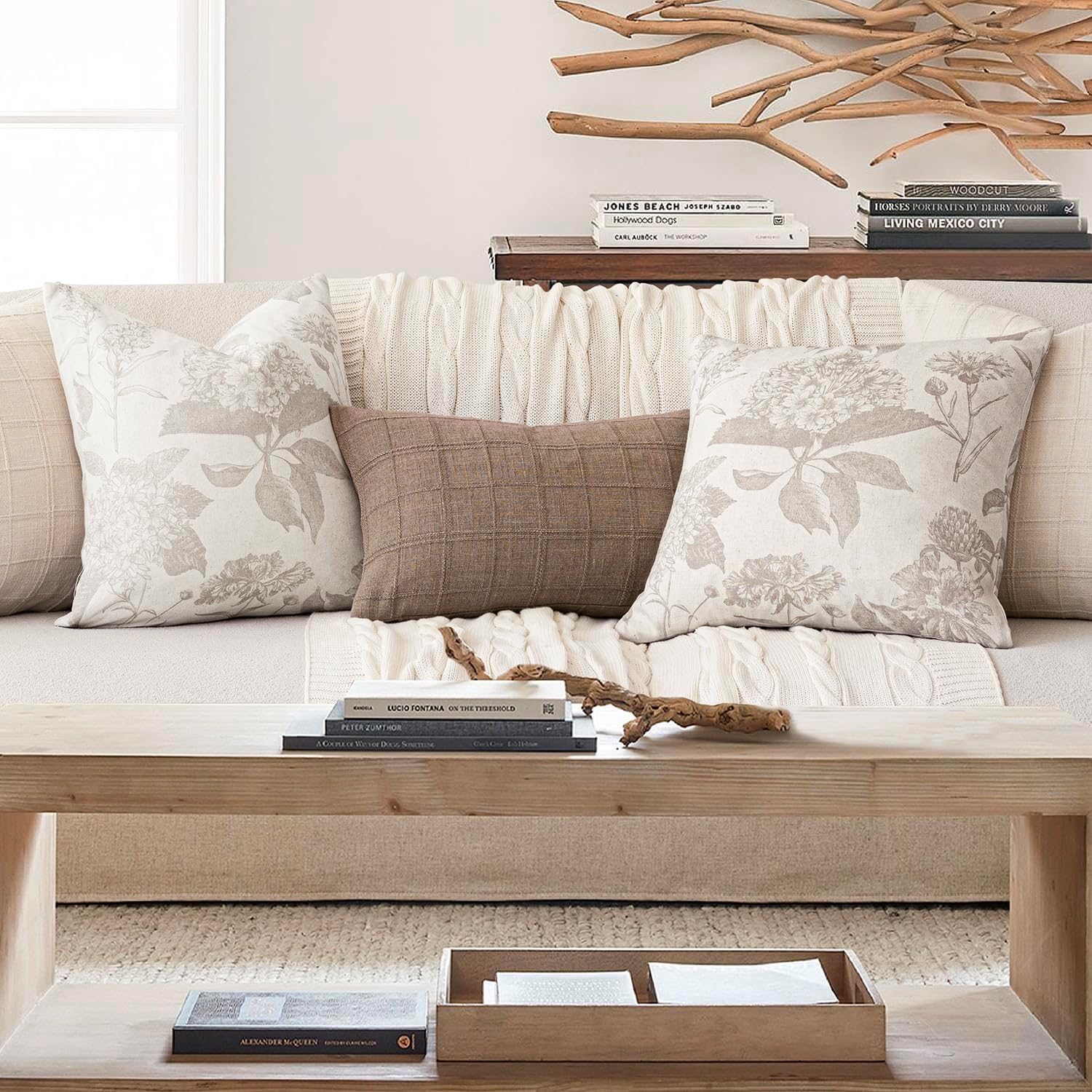 Foindtower Set of 2 Linen Floral Vintage Throw Pillow Covers Neutral Accent Decorative Cushion Covers Farmhouse Boho Home Decor for Sofa Chair Couch Bedroom Living Room Outdoor,24×24 Inch,Tan Beige