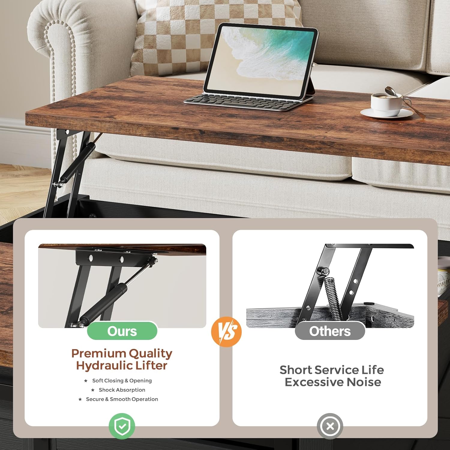 - 【Practical Lift-Top Design】:Equipped with high-quality lifting mechanisms and innovative stabilizing rod design, you can adjust the coffee tables top height from 18.1 to 23.6 inches to easily accommodate a variety of scenarios, such as working, dining, or gaming. Besides, the lift top coffee table is fitted with 4 silent pads, ensuring a gentle and noise-free descent of the tabletop.Max Lifted:25Lb.